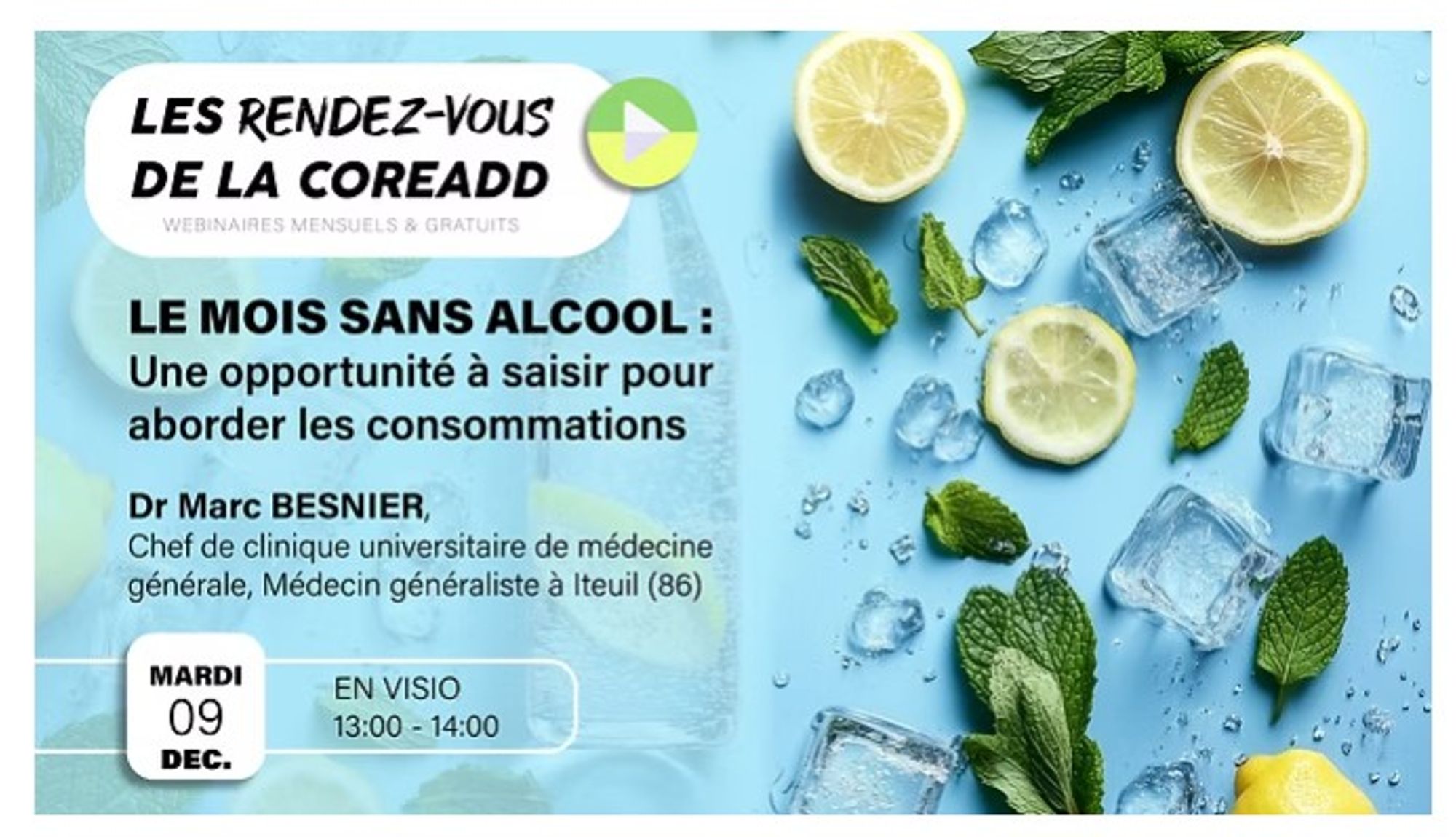 Webinaire "Mois sans alcool : une opportunité à saisir pour aborder les consommations" 09/12/2025, 13h-14h Organisateur COREADD N-A Animé par Dr Marc BESNIER Inscription en ligne Type d'événement Webinaire Rôle d'ARCA-Sud Autres événements Thèmes produit/comportement Alcool Publics Professionnel