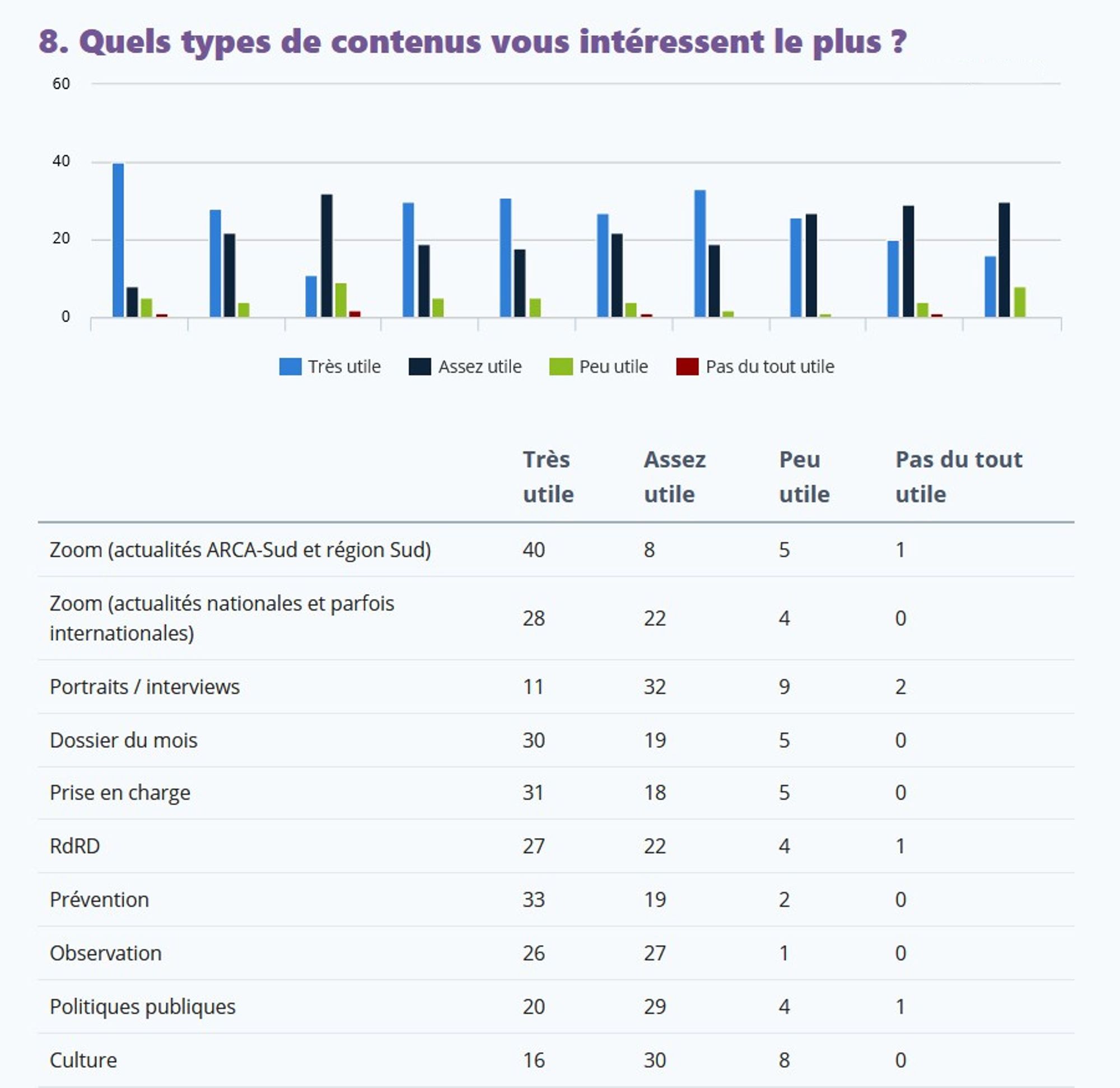 Les rubriques les plus appréciées sont : Dossier du mois, Prise en charge, ainsi que Prévention et Réduction des Risques et des Dommages (RdRD).