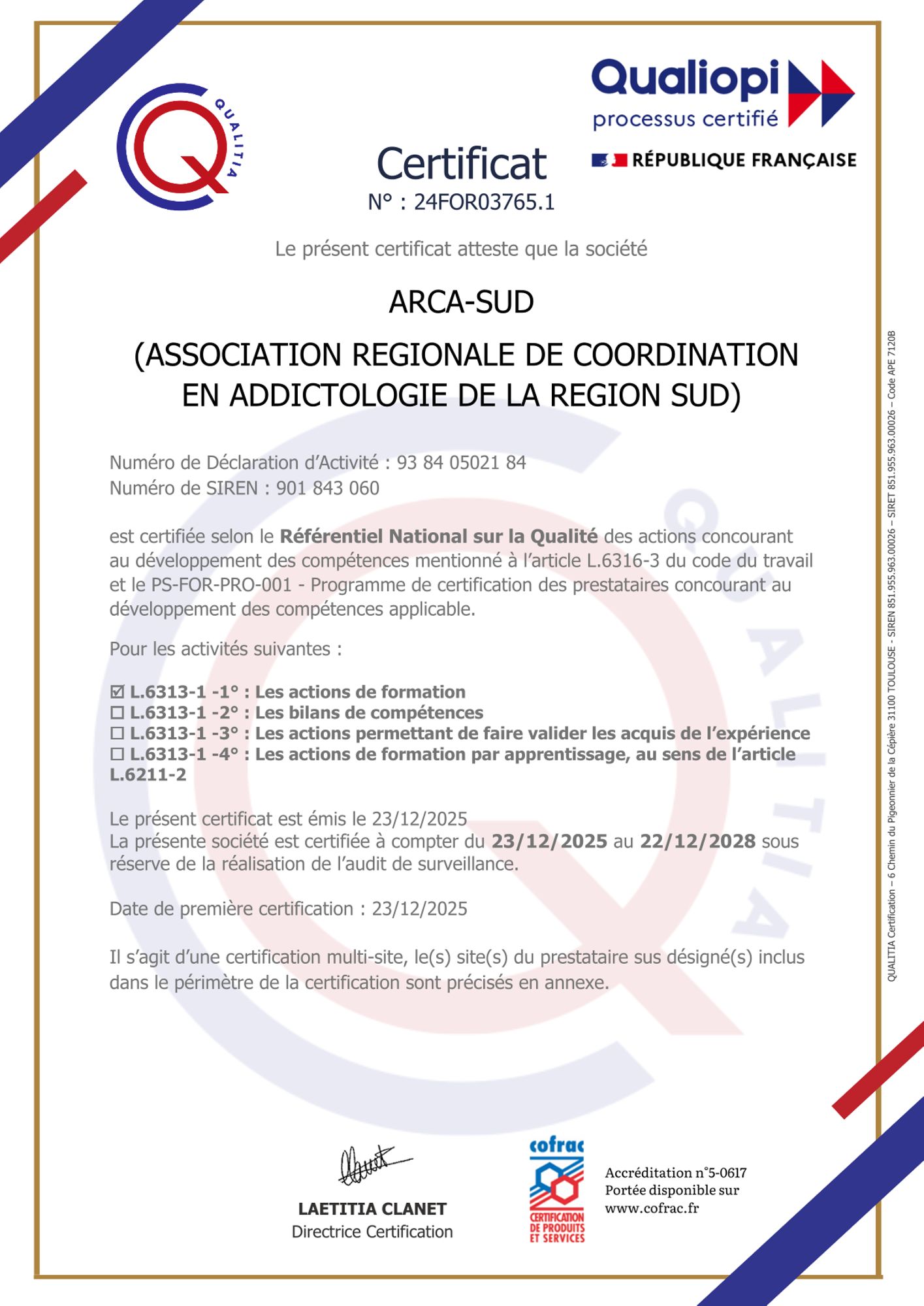 Instaurée par la loi du 5 septembre 2018 « pour la liberté de choisir son avenir professionnel », la certification Qualiopi constitue un gage de confiance et une reconnaissance de l’engagement d’ARCA-Sud en faveur de formations de qualité au service de la santé publique et de l’addictologie.
