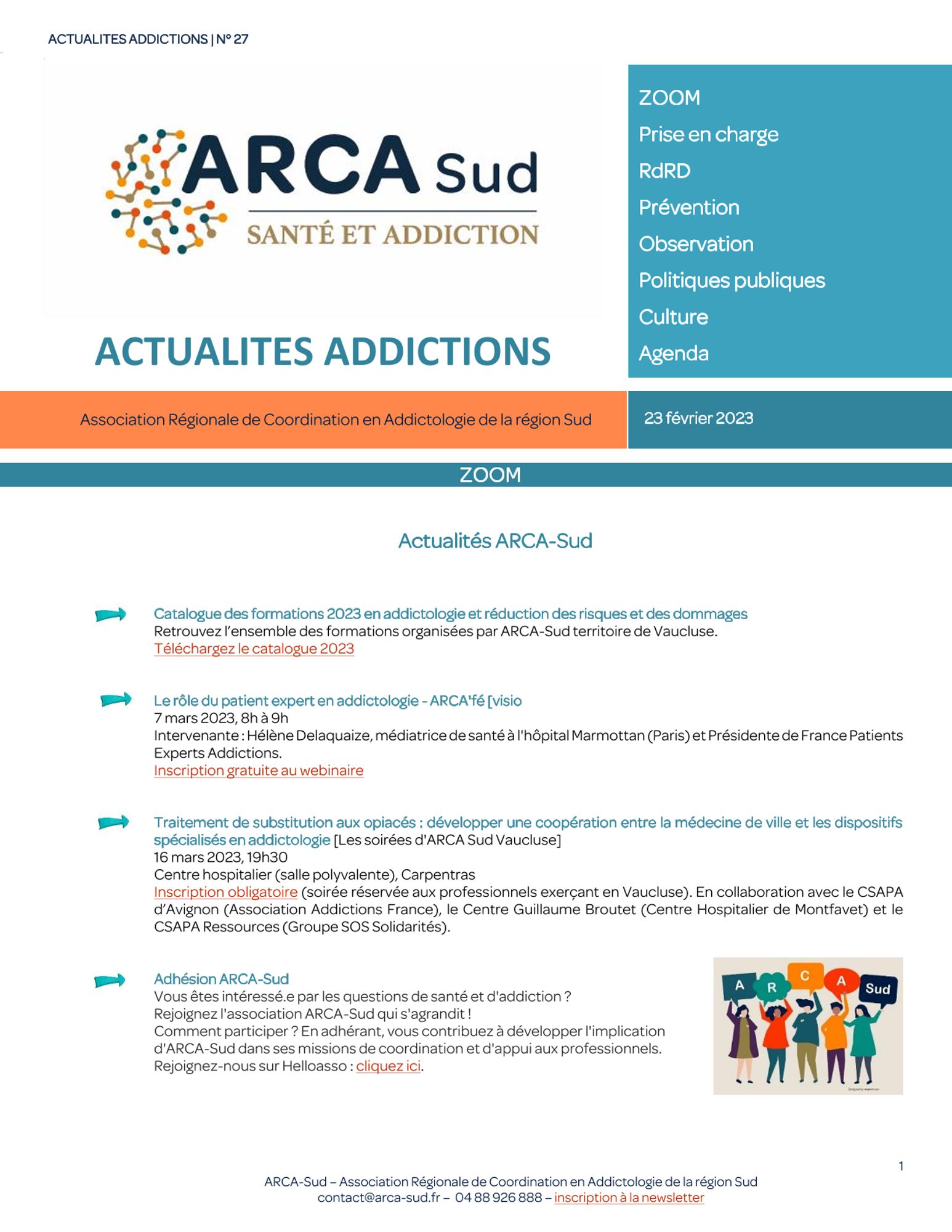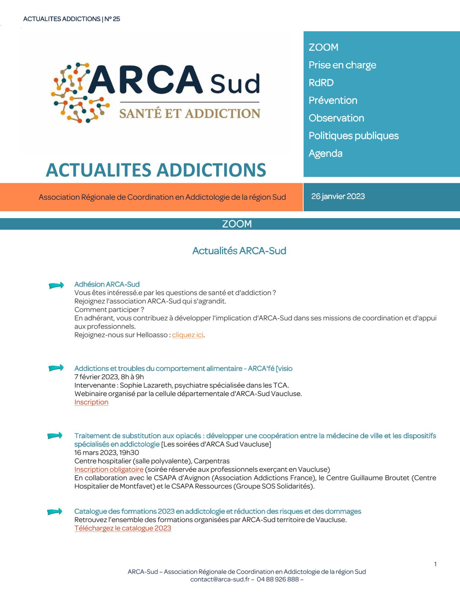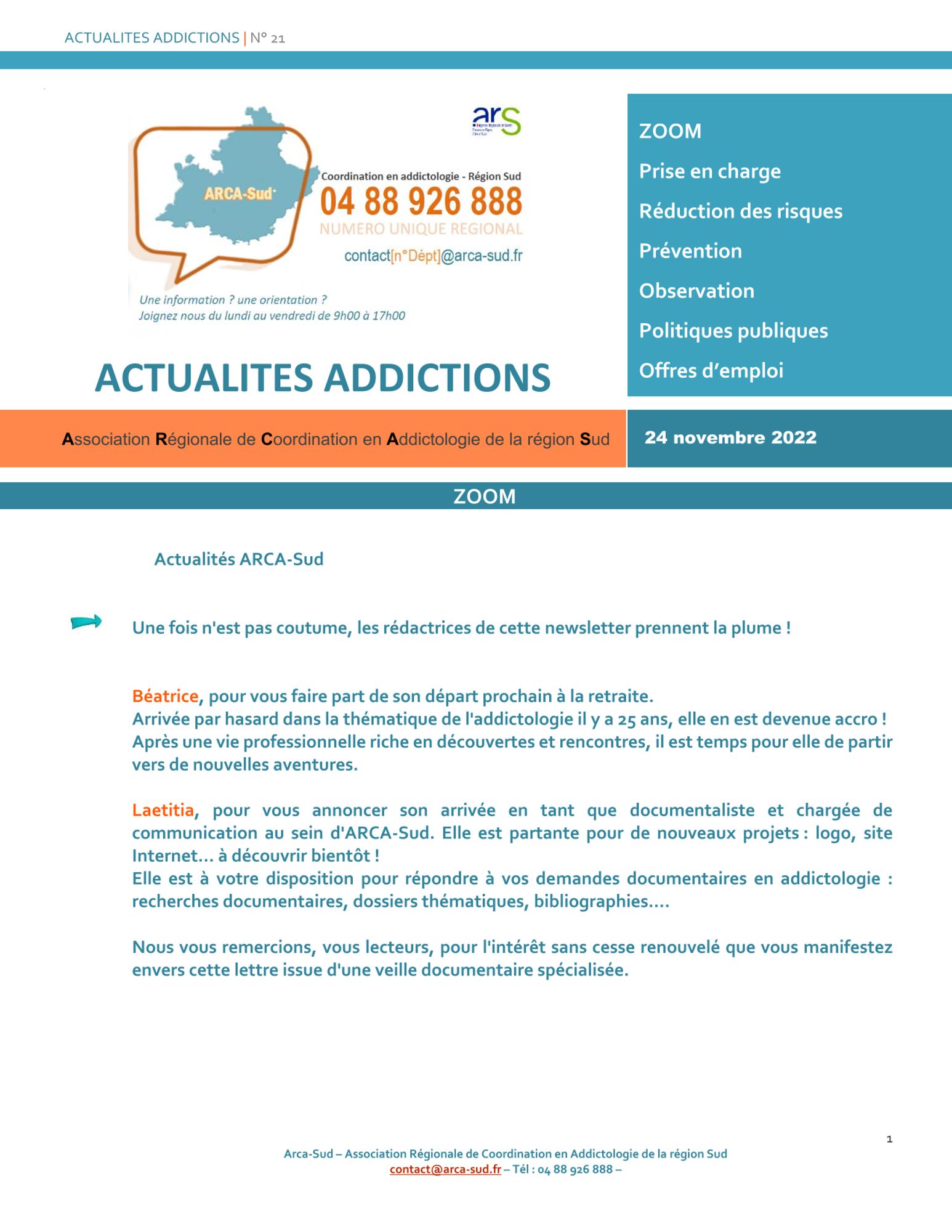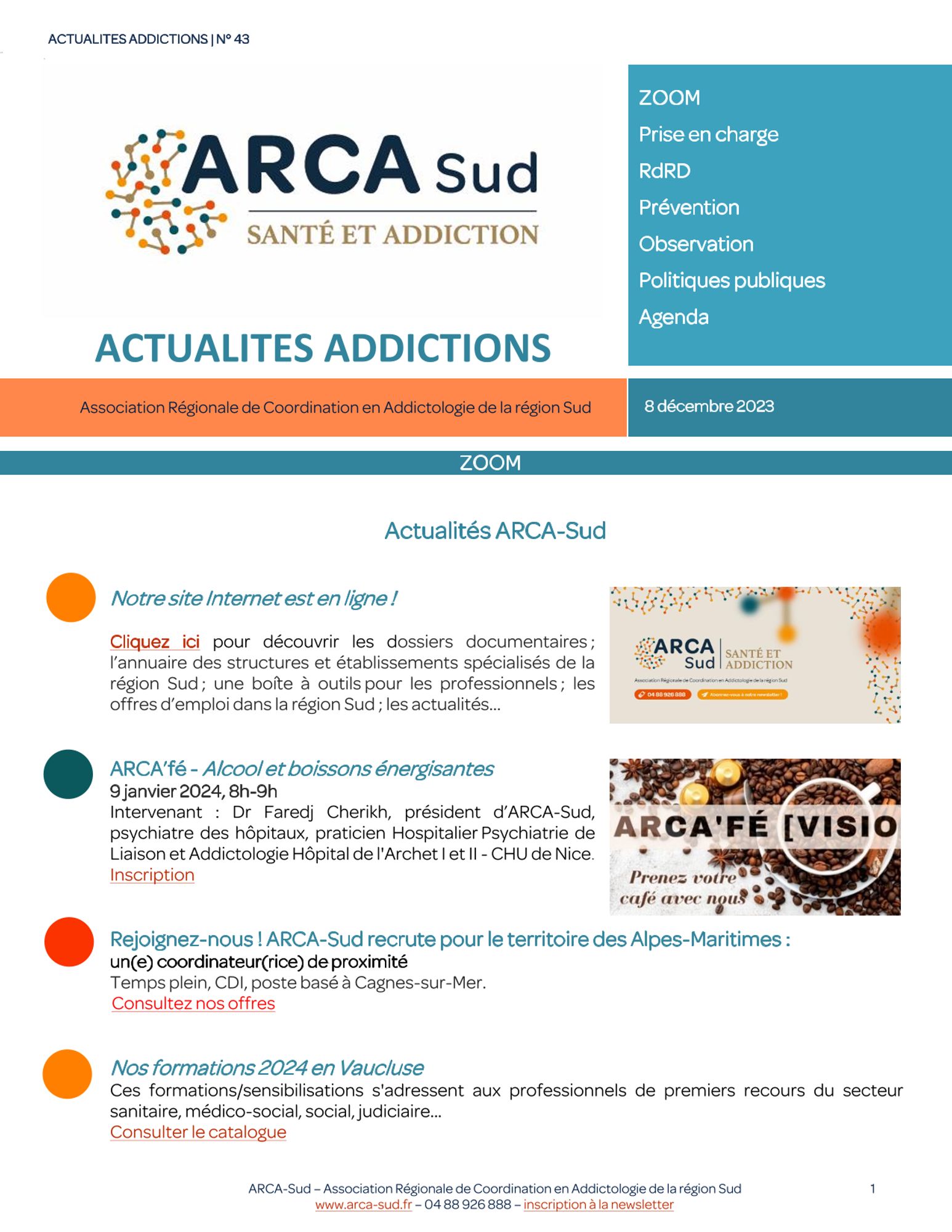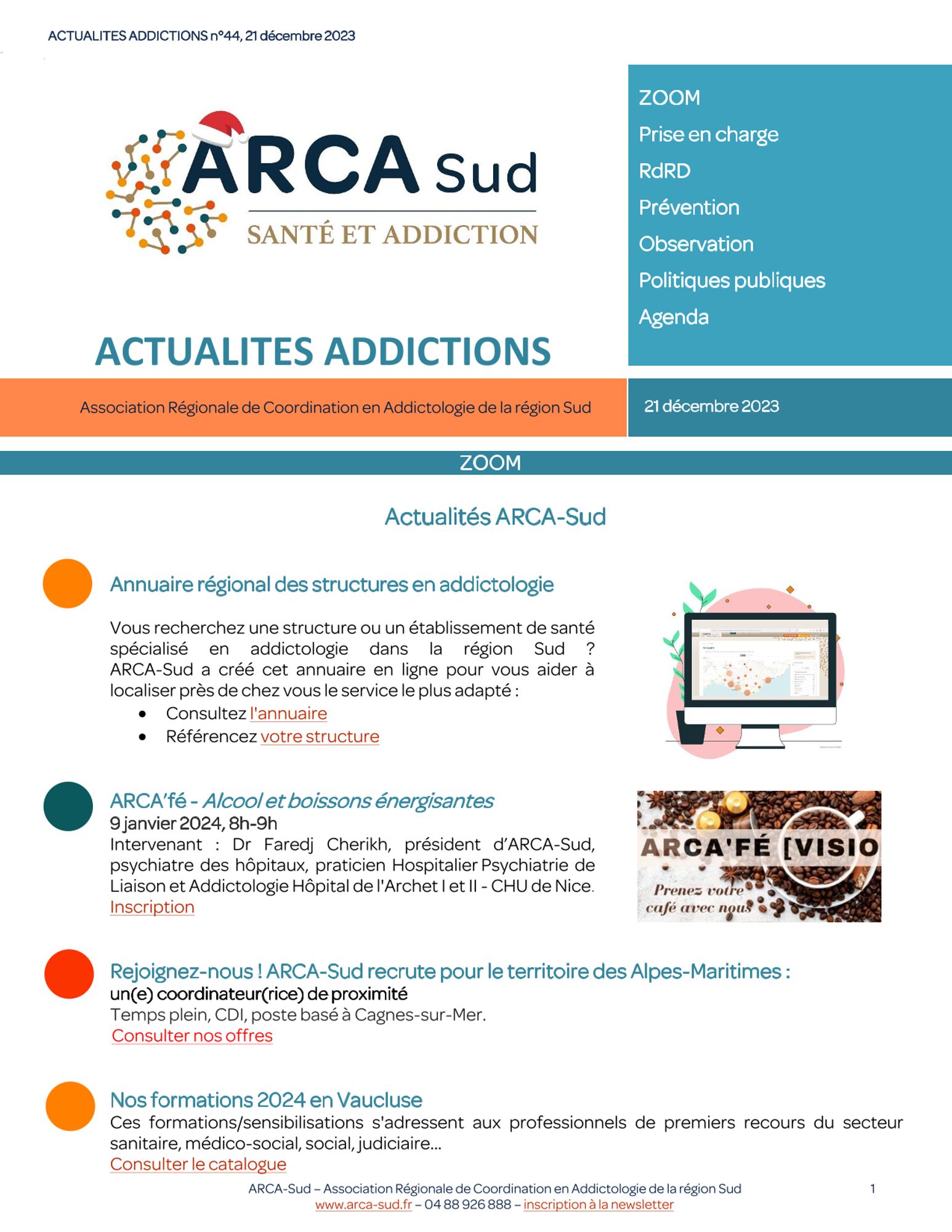 Chaque mois, deux newsletters résument l'actualité : prise en charge, réduction des risques et des dommages, prévention, données d'observation, politiques publiques, l'actualité en région PACA et au national.