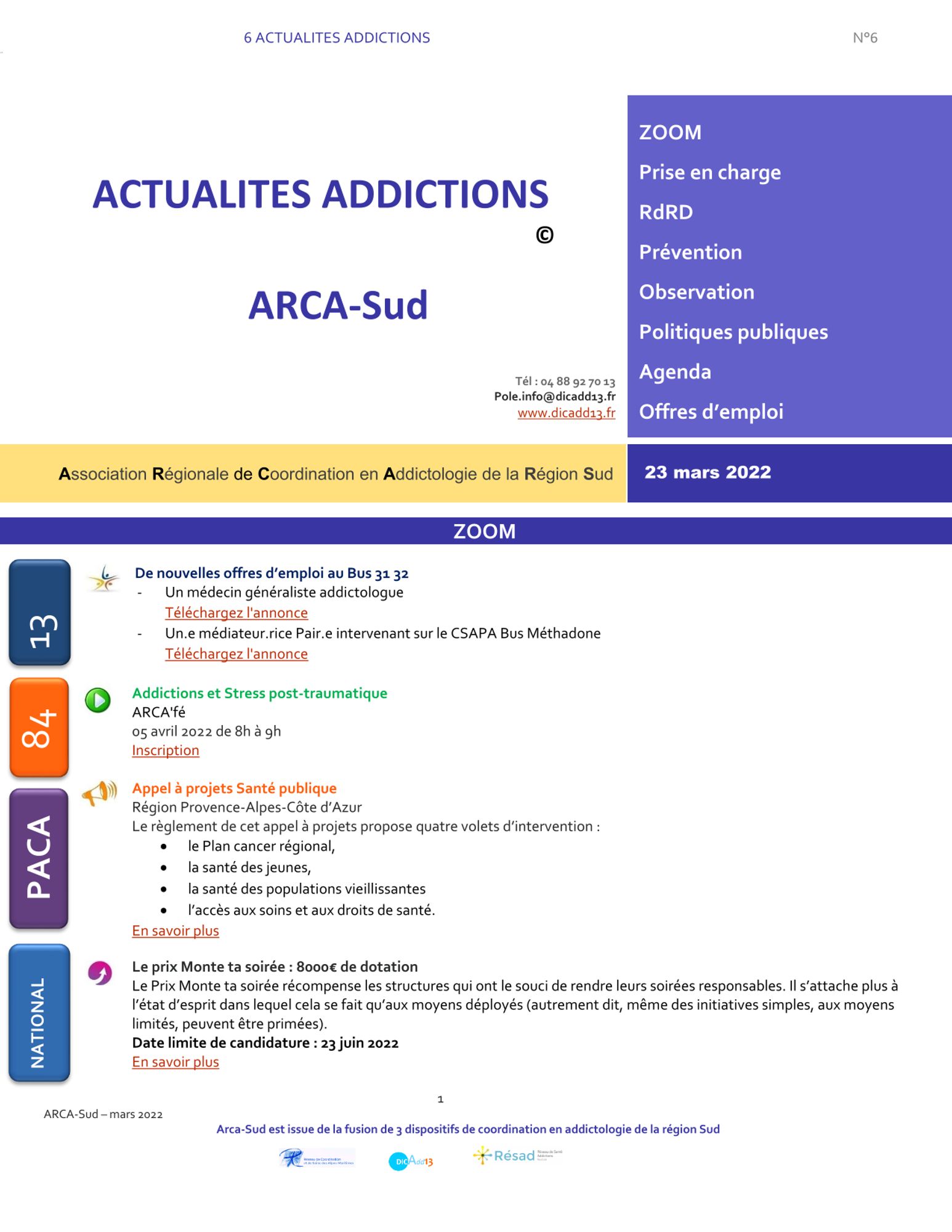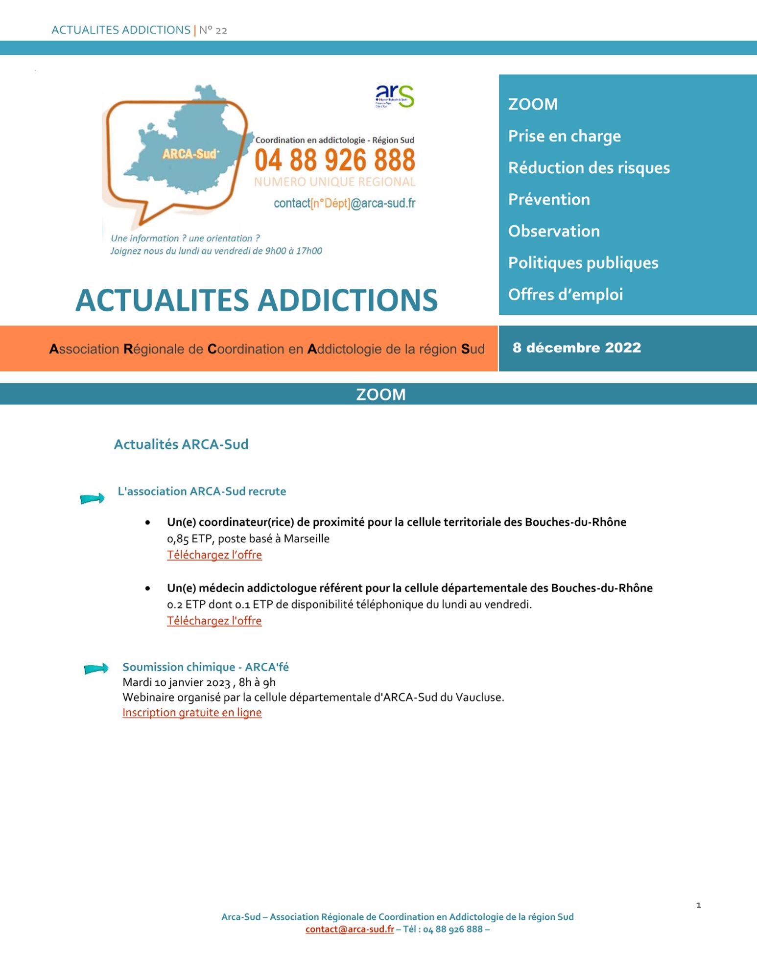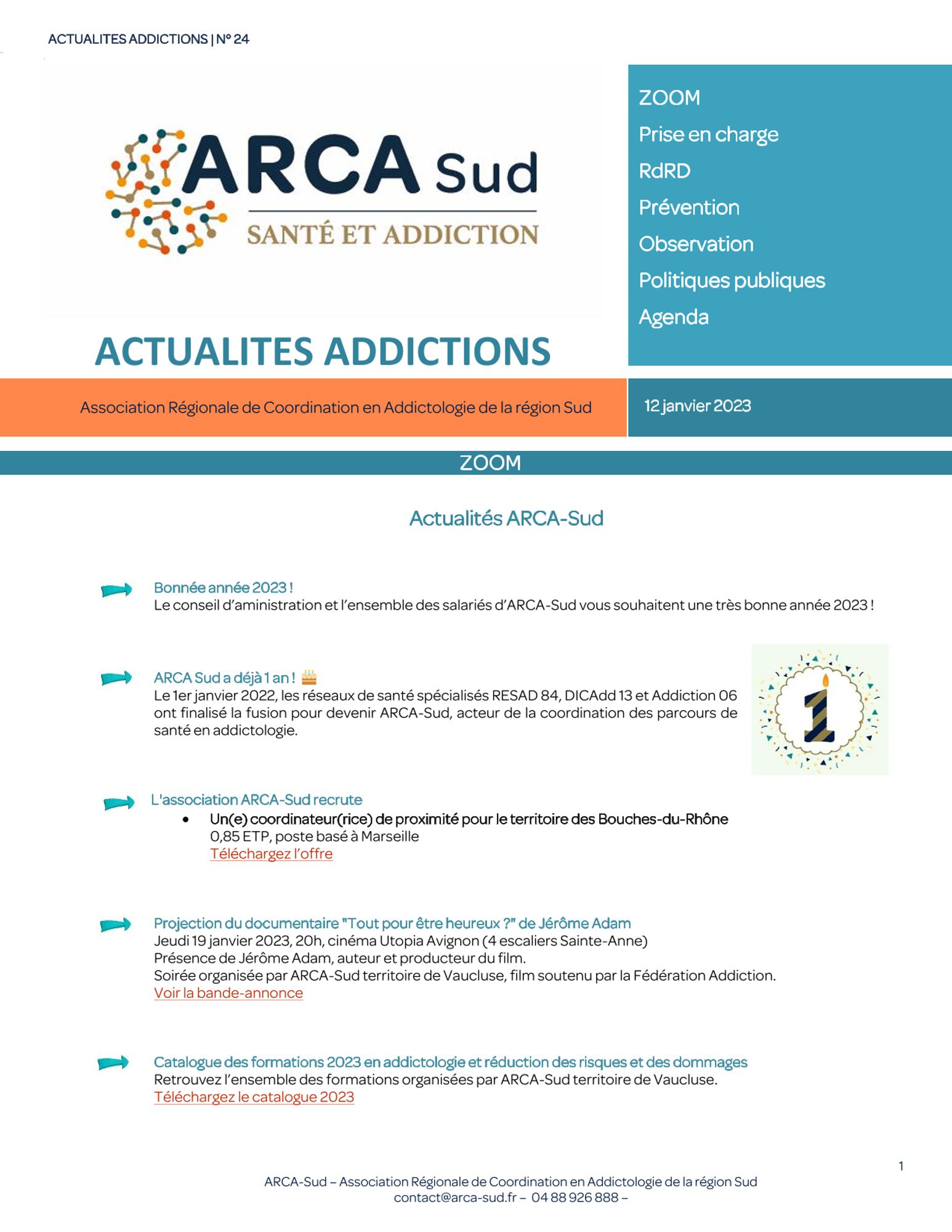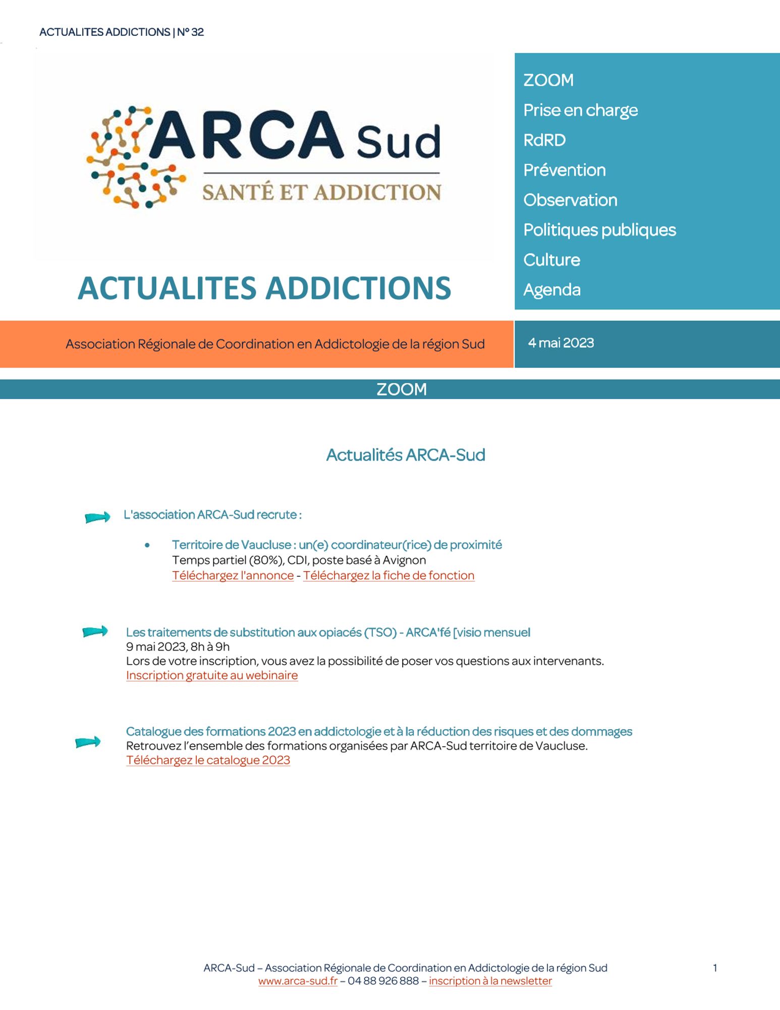 Chaque mois, deux newsletters résument l'actualité : prise en charge, réduction des risques et des dommages, prévention, données d'observation, politiques publiques, l'actualité en région PACA et au national.