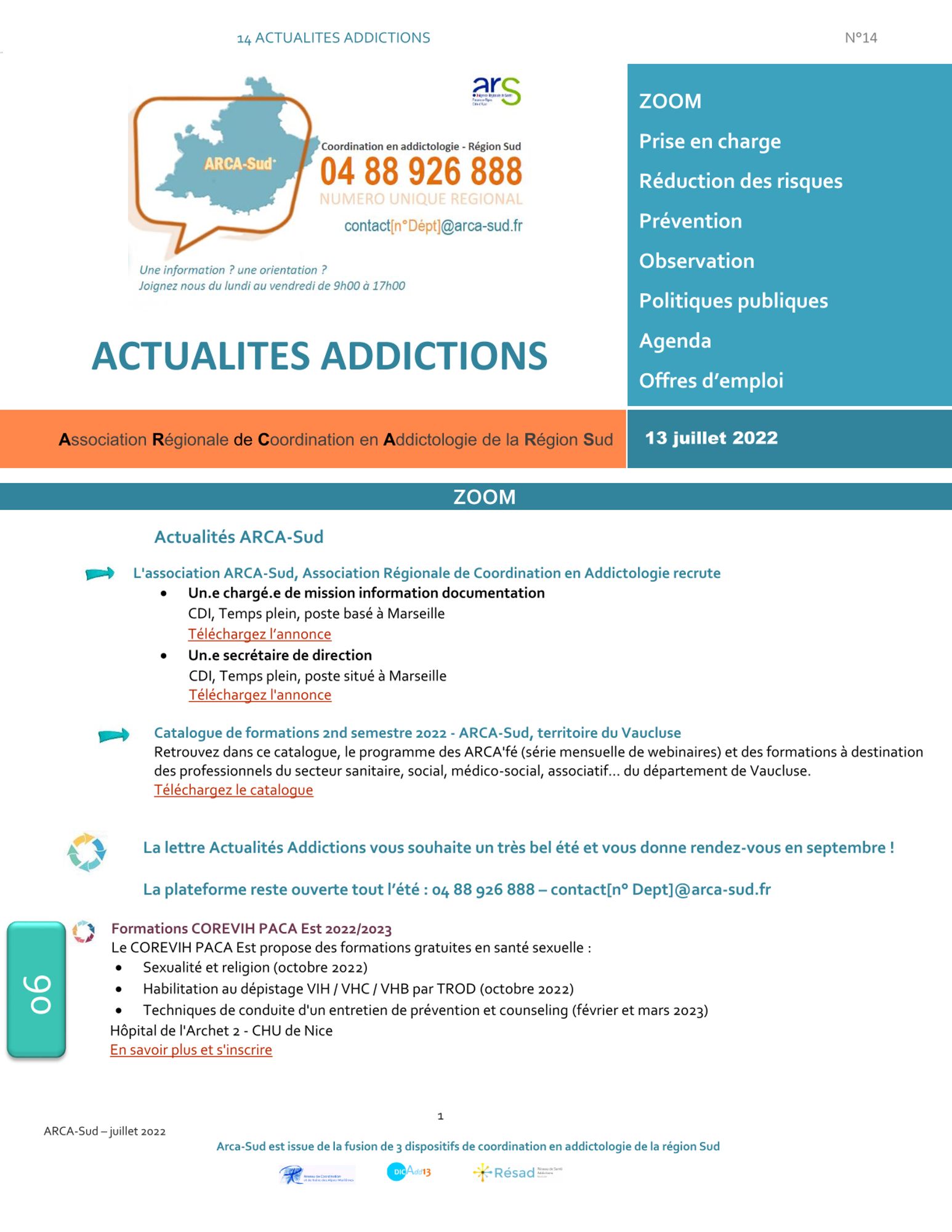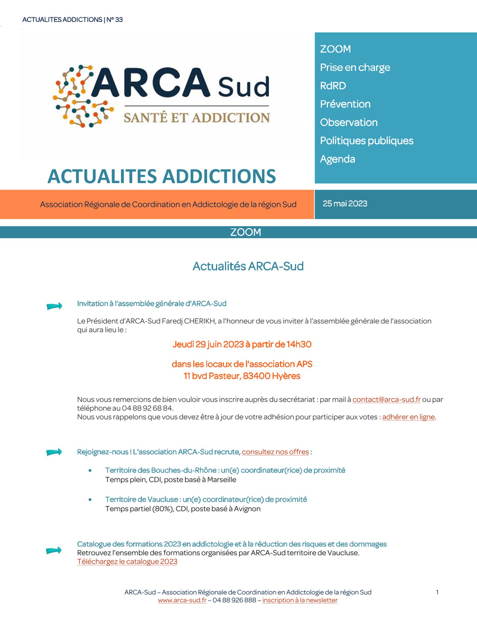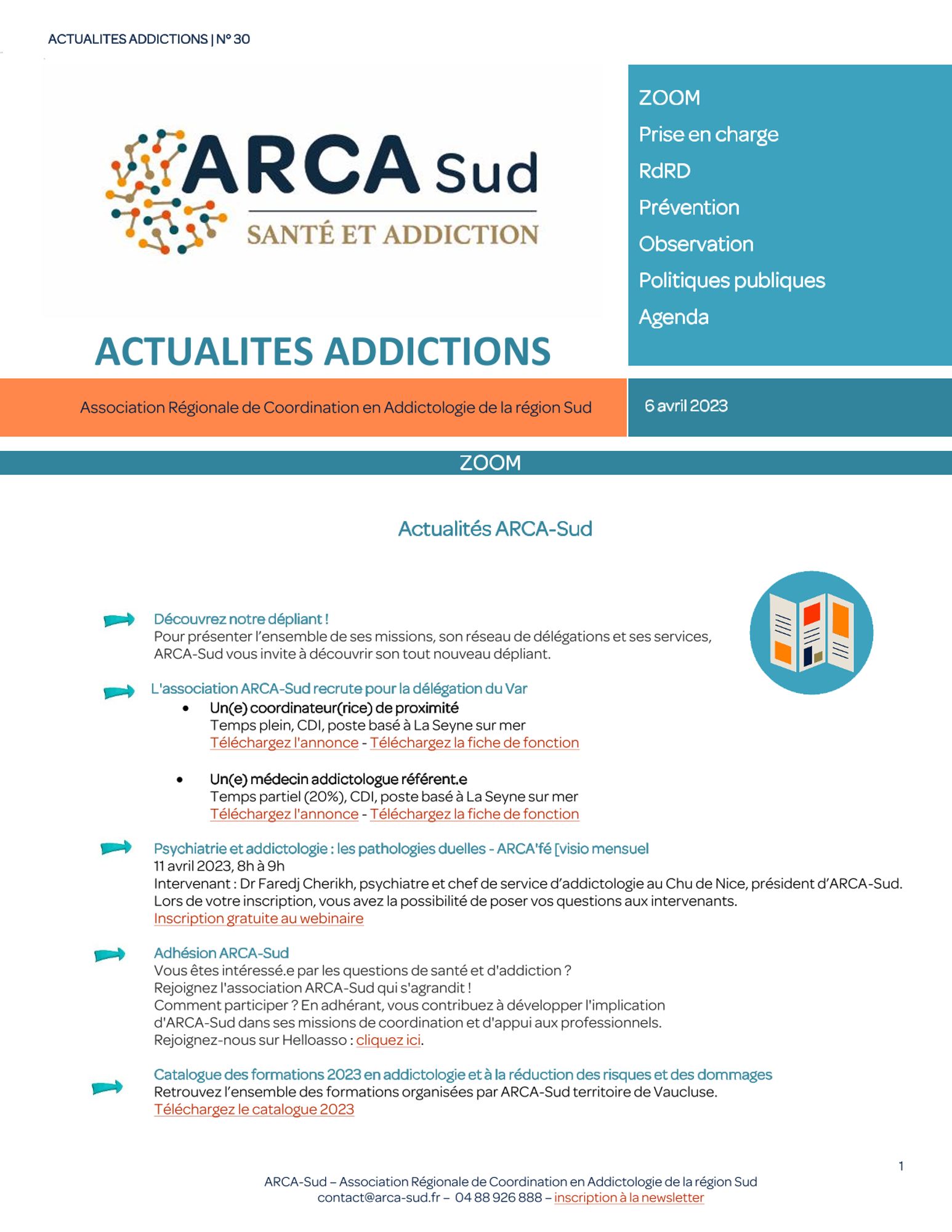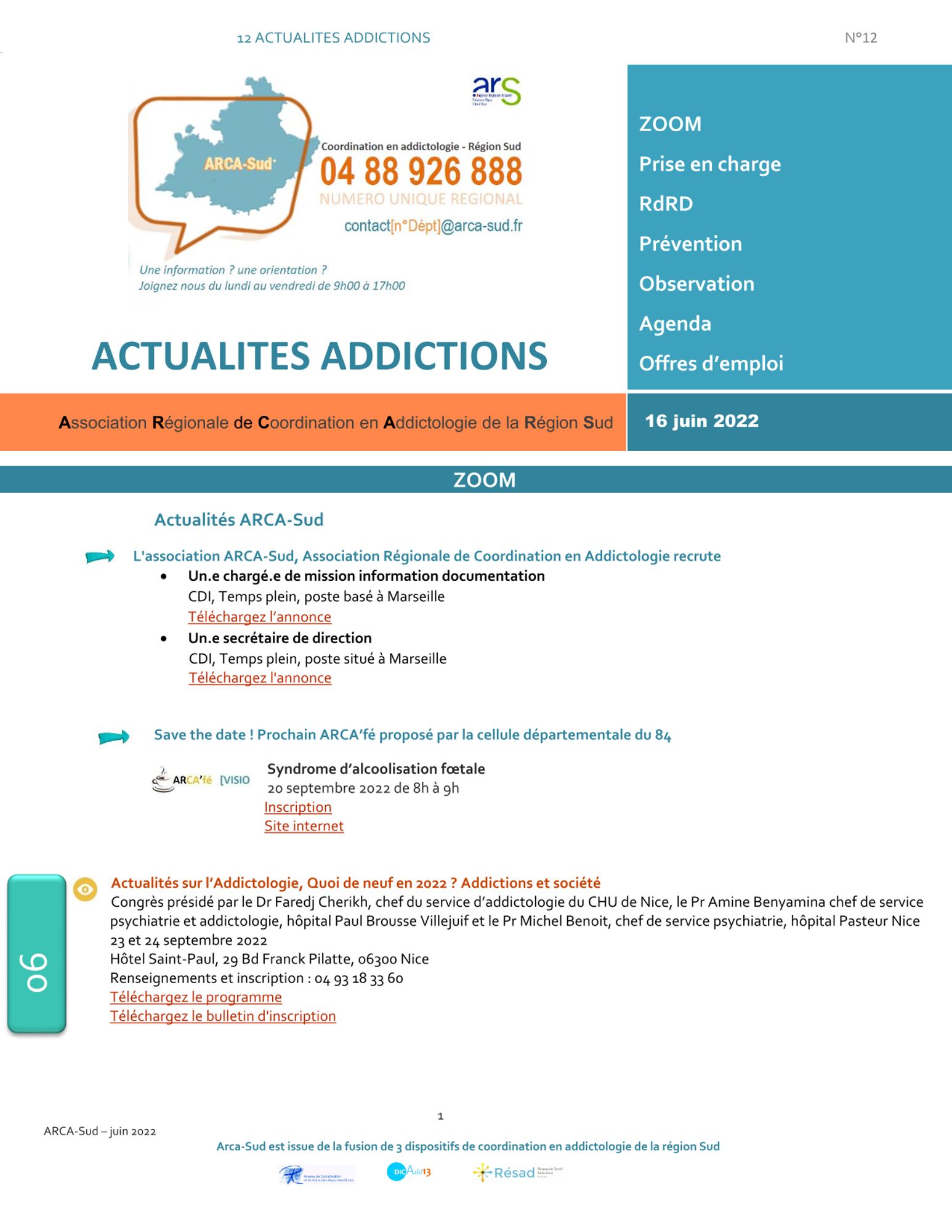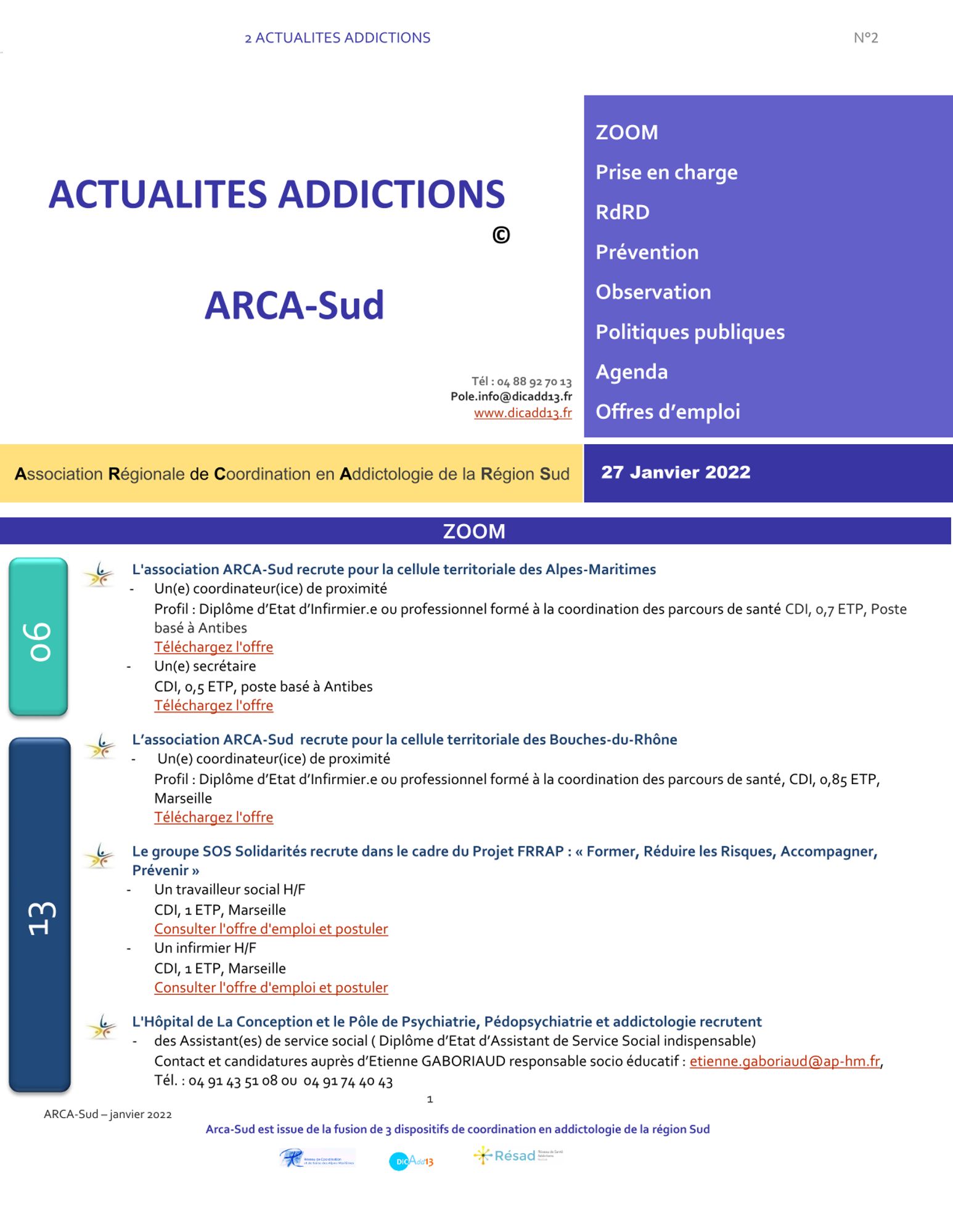Chaque mois, deux newsletters résument l'actualité : prise en charge, réduction des risques et des dommages, prévention, données d'observation, politiques publiques, l'actualité en région PACA et au national.