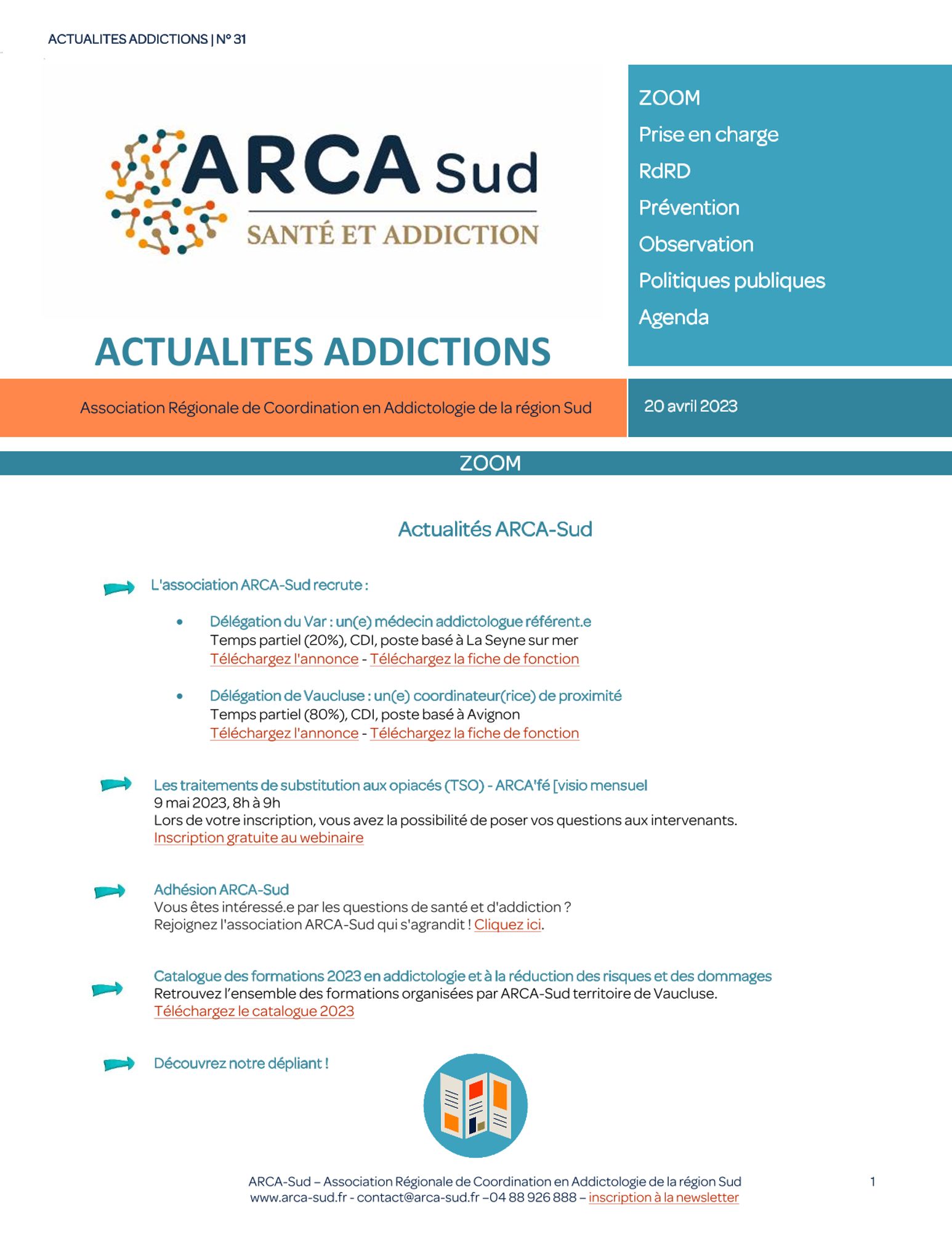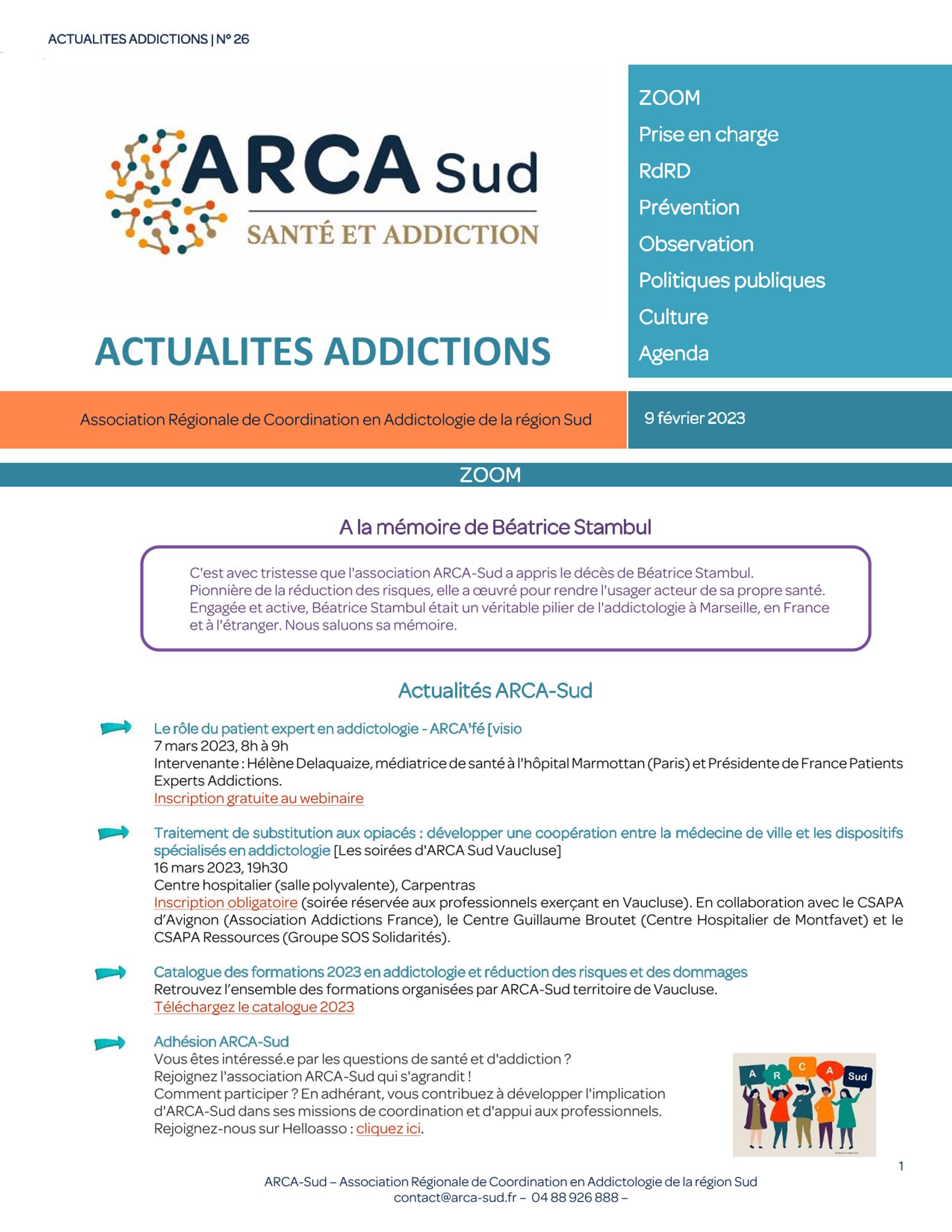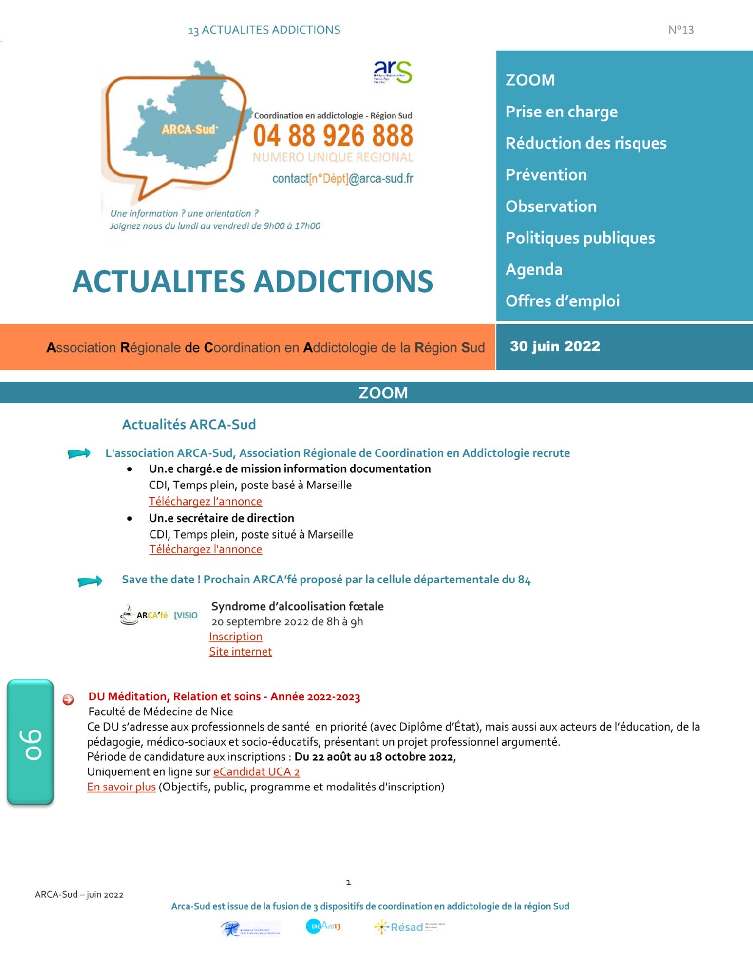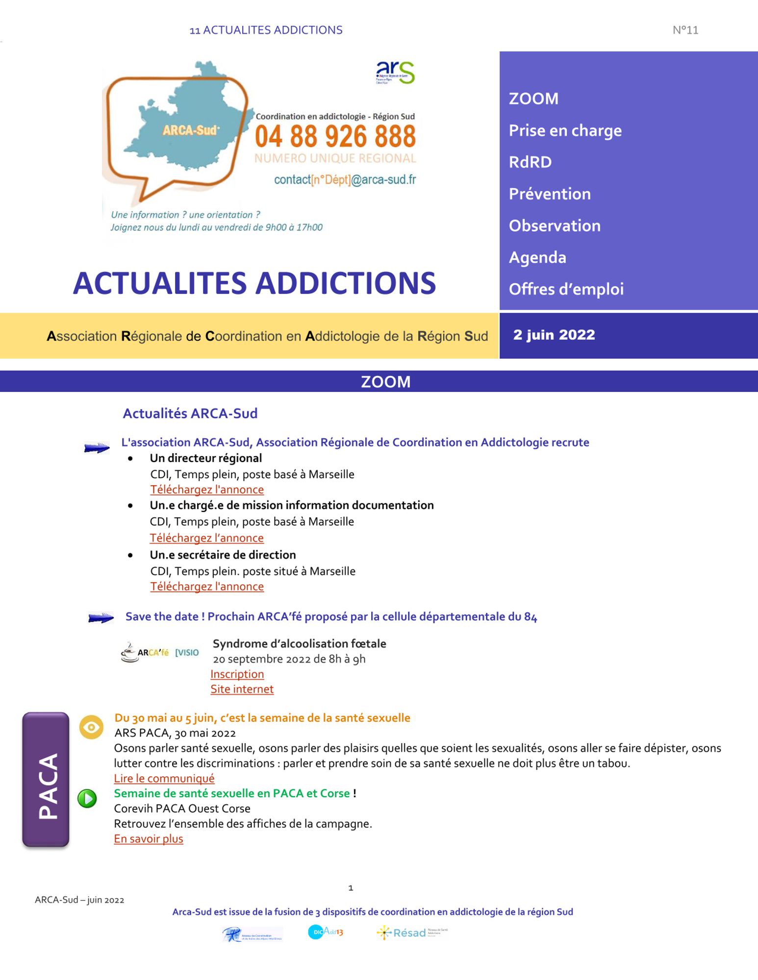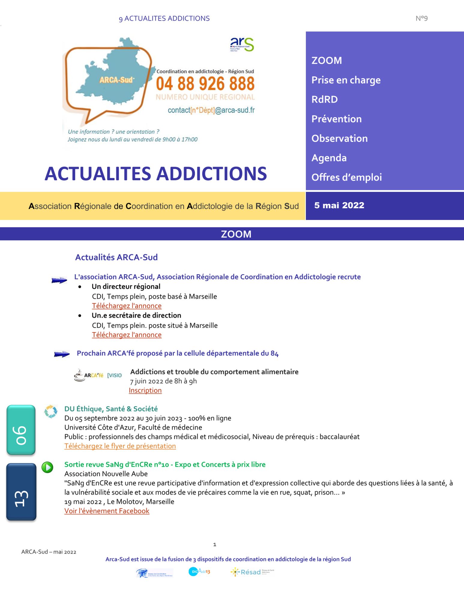 Chaque mois, deux newsletters résument l'actualité : prise en charge, réduction des risques et des dommages, prévention, données d'observation, politiques publiques, l'actualité en région PACA et au national.