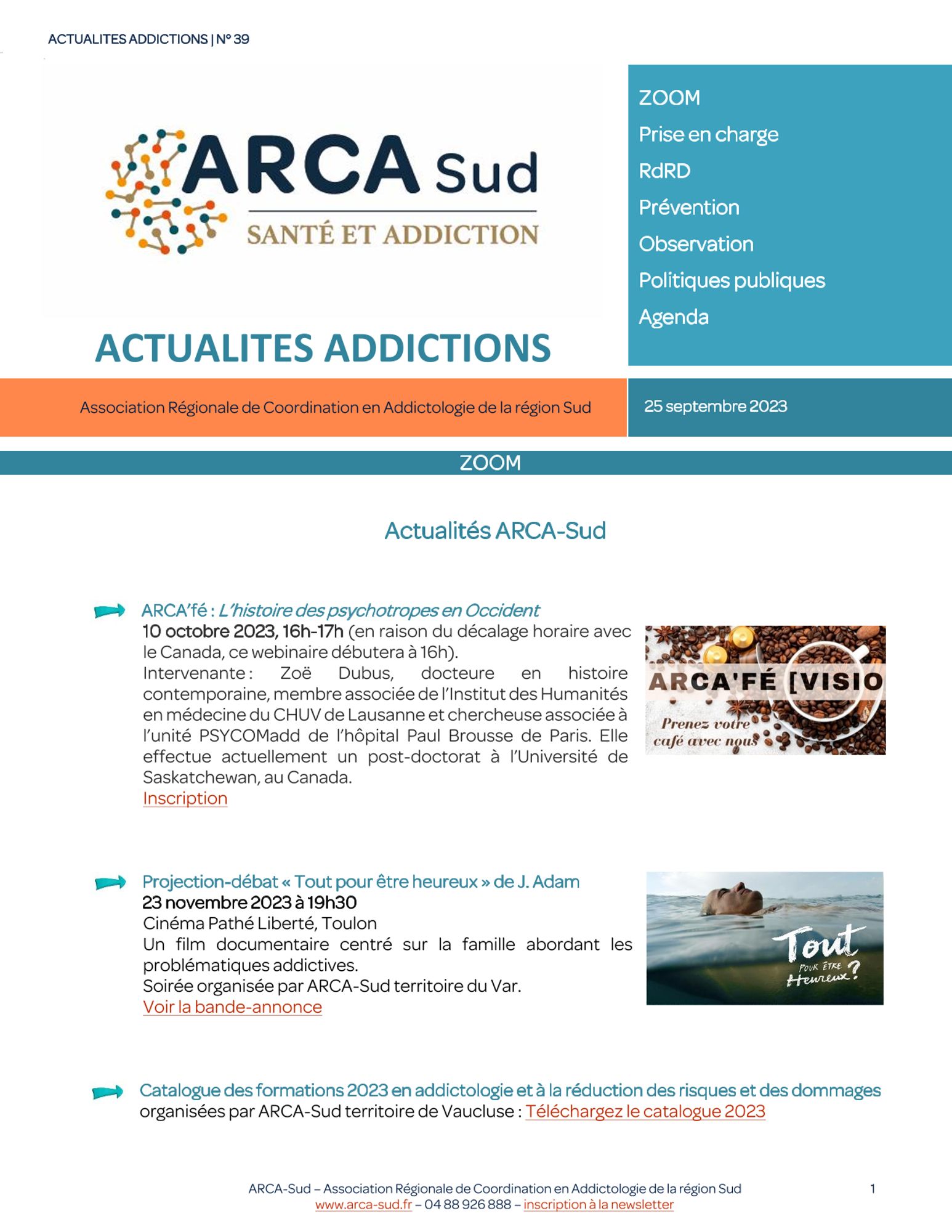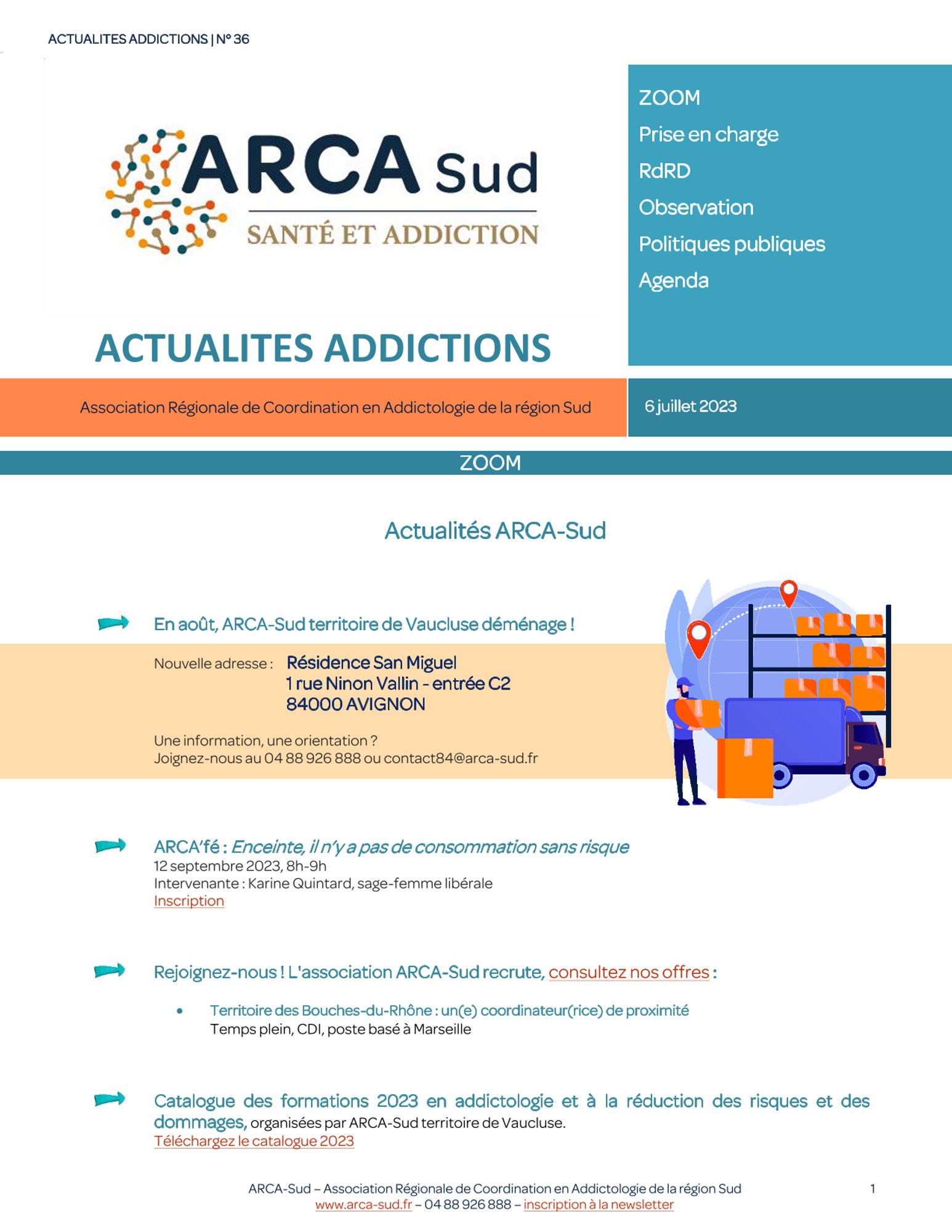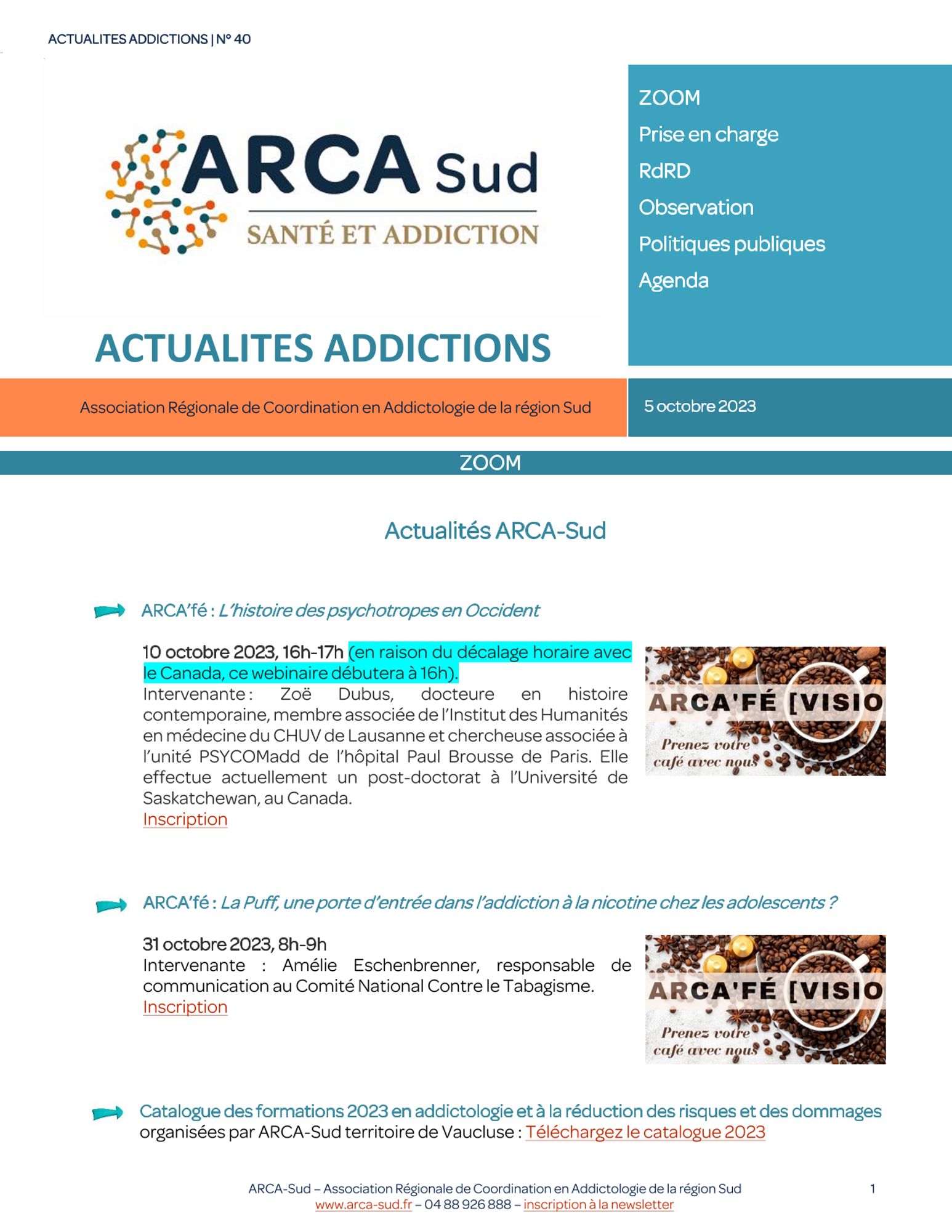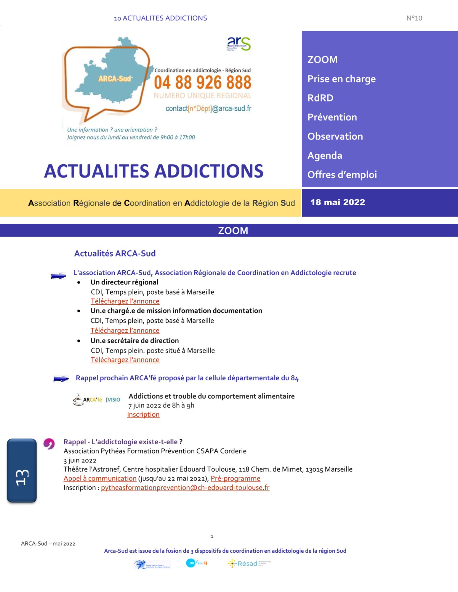 Chaque mois, deux newsletters résument l'actualité : prise en charge, réduction des risques et des dommages, prévention, données d'observation, politiques publiques, l'actualité en région PACA et au national.