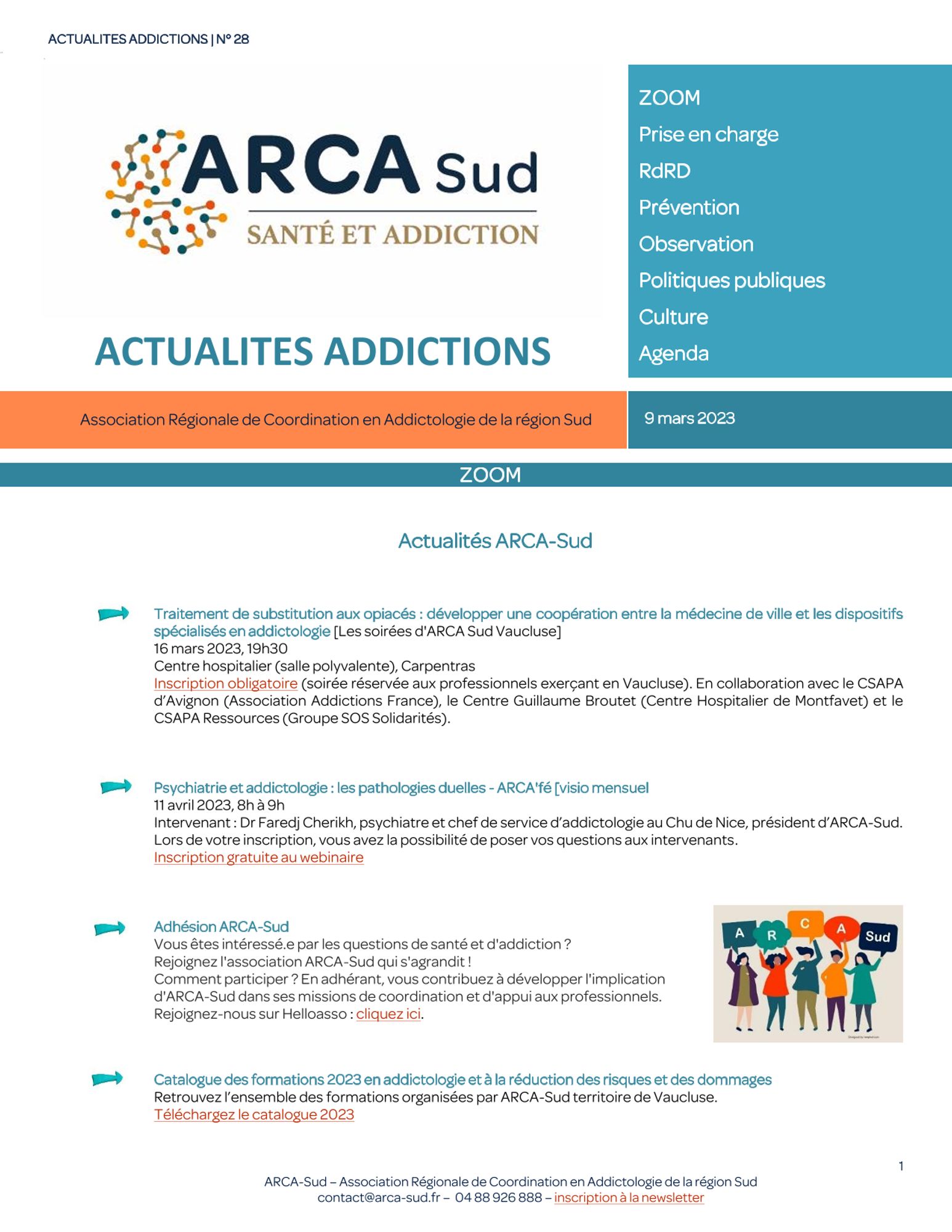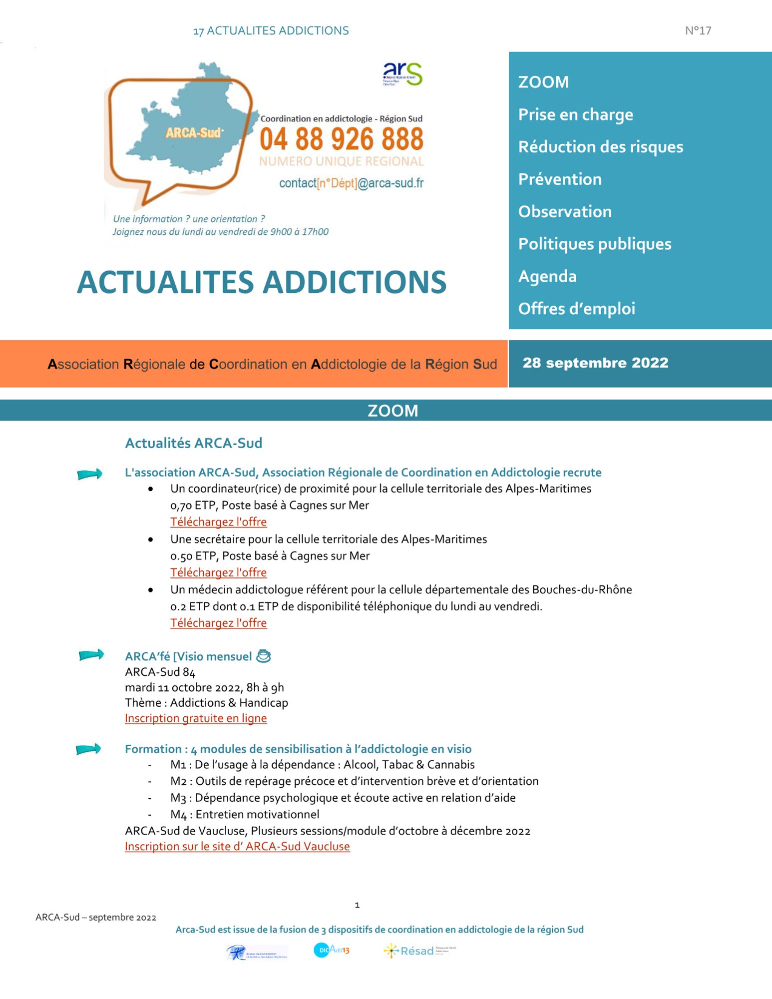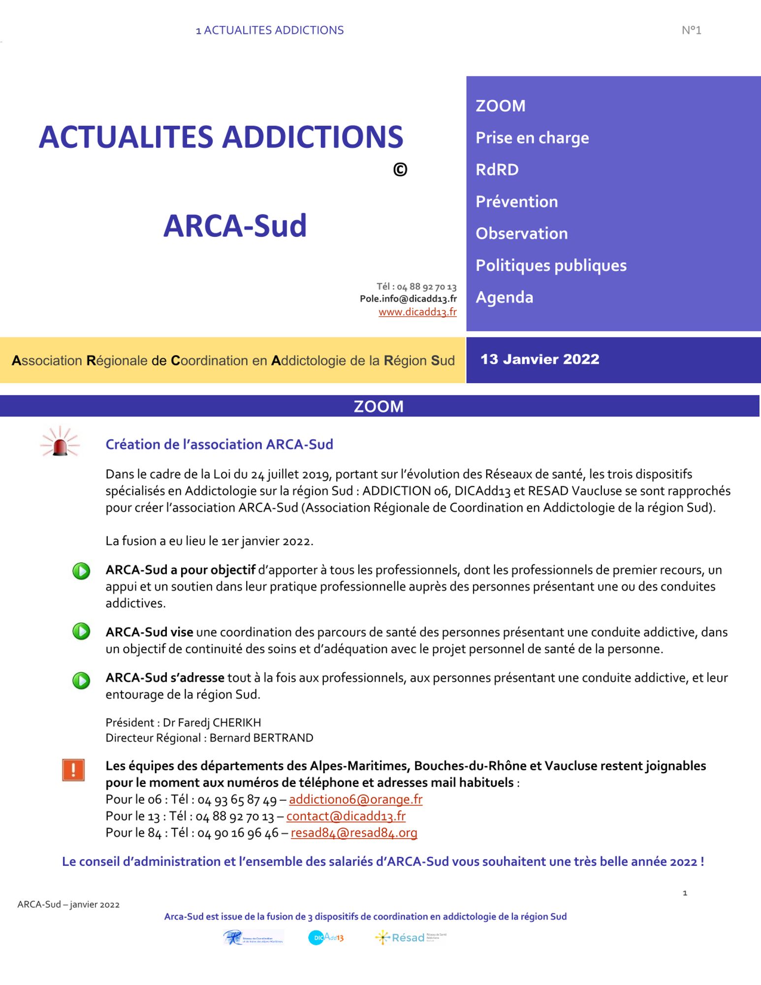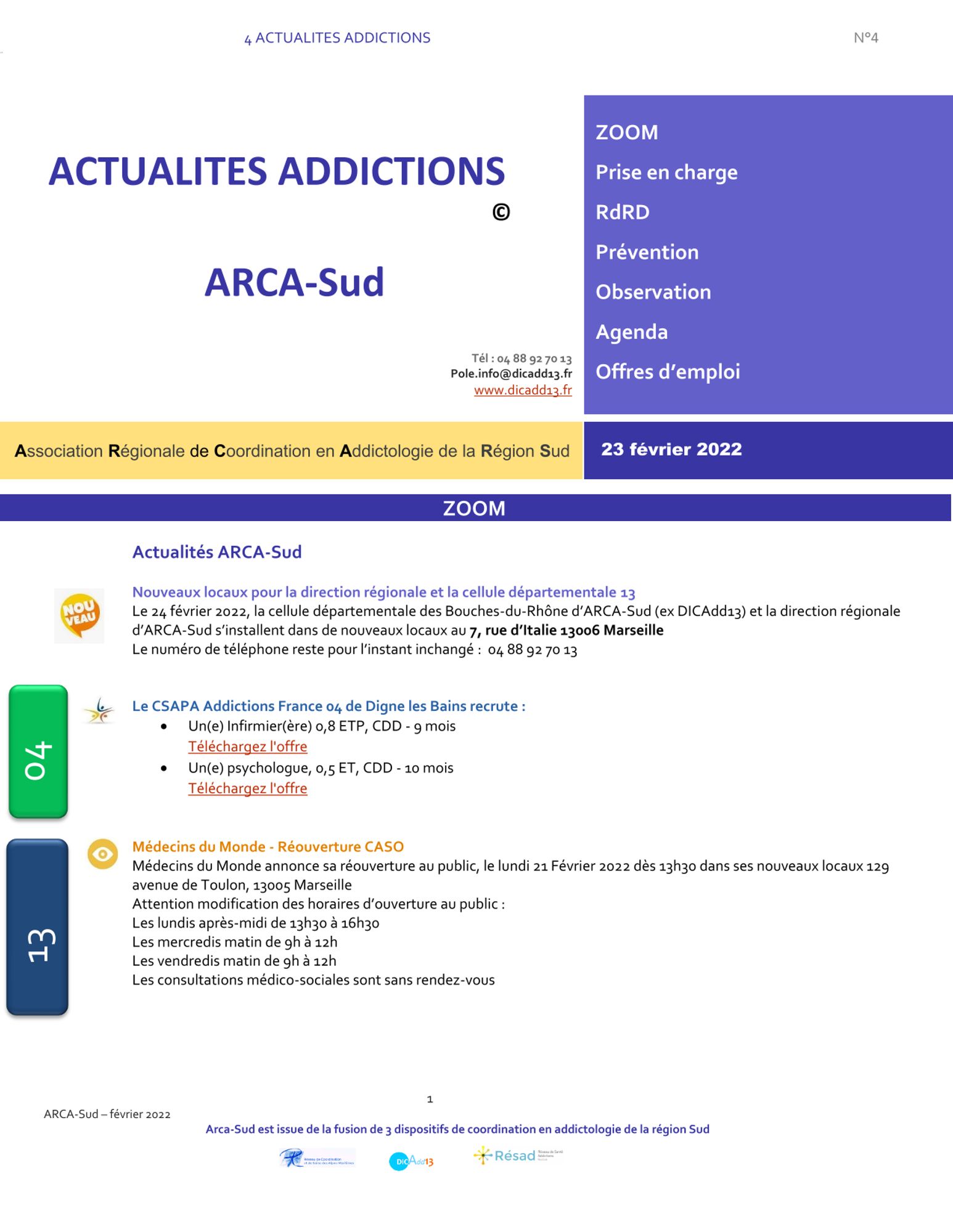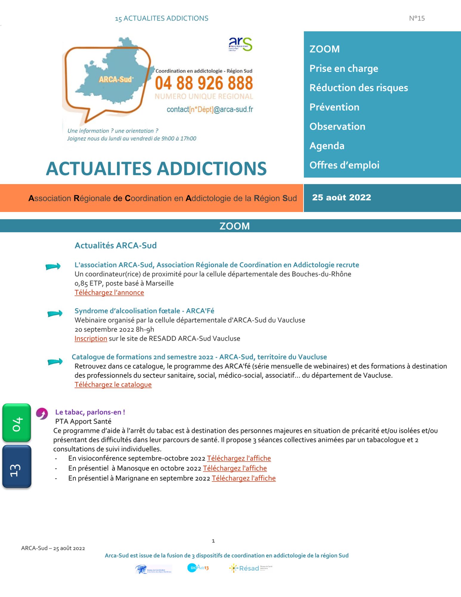 Chaque mois, deux newsletters résument l'actualité : prise en charge, réduction des risques et des dommages, prévention, données d'observation, politiques publiques, l'actualité en région PACA et au national.
