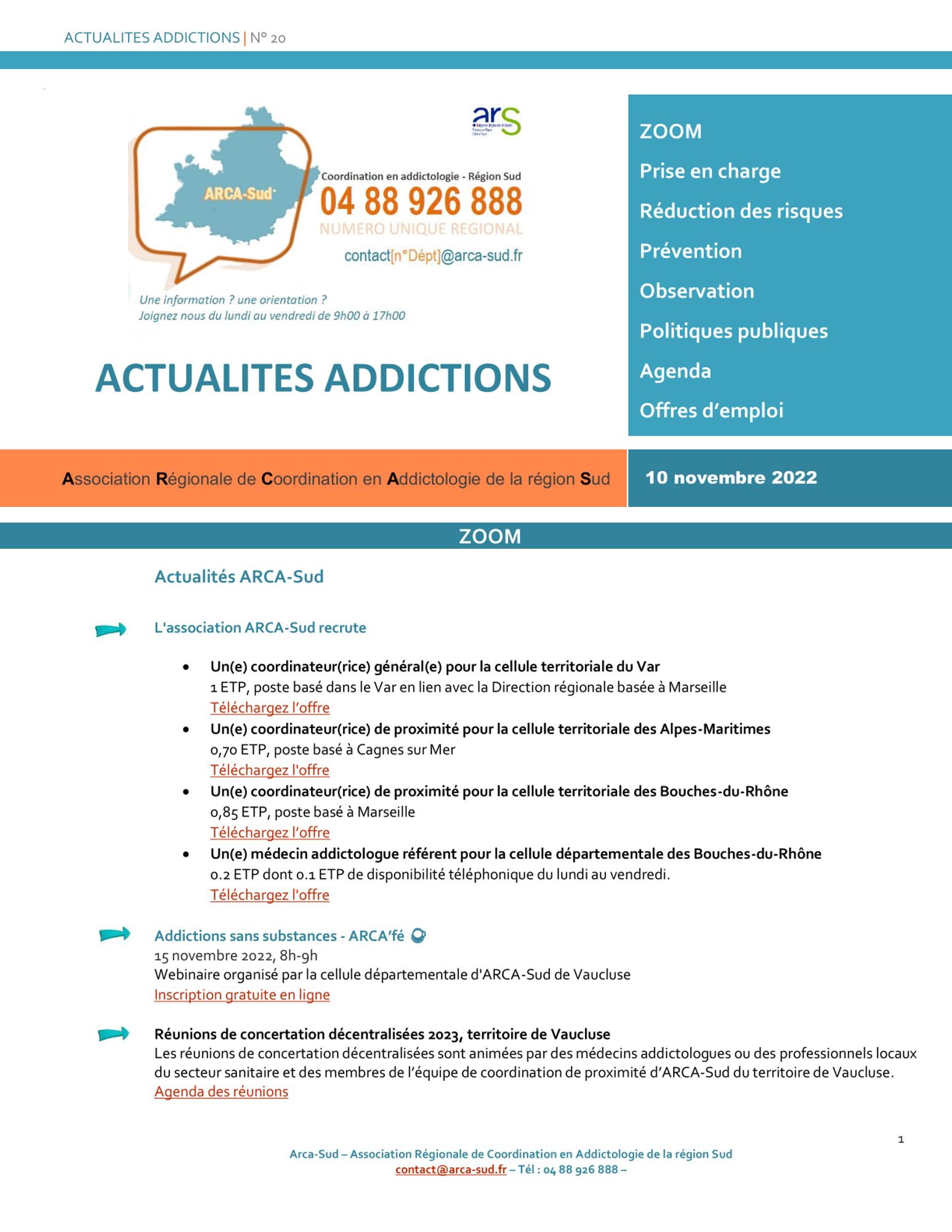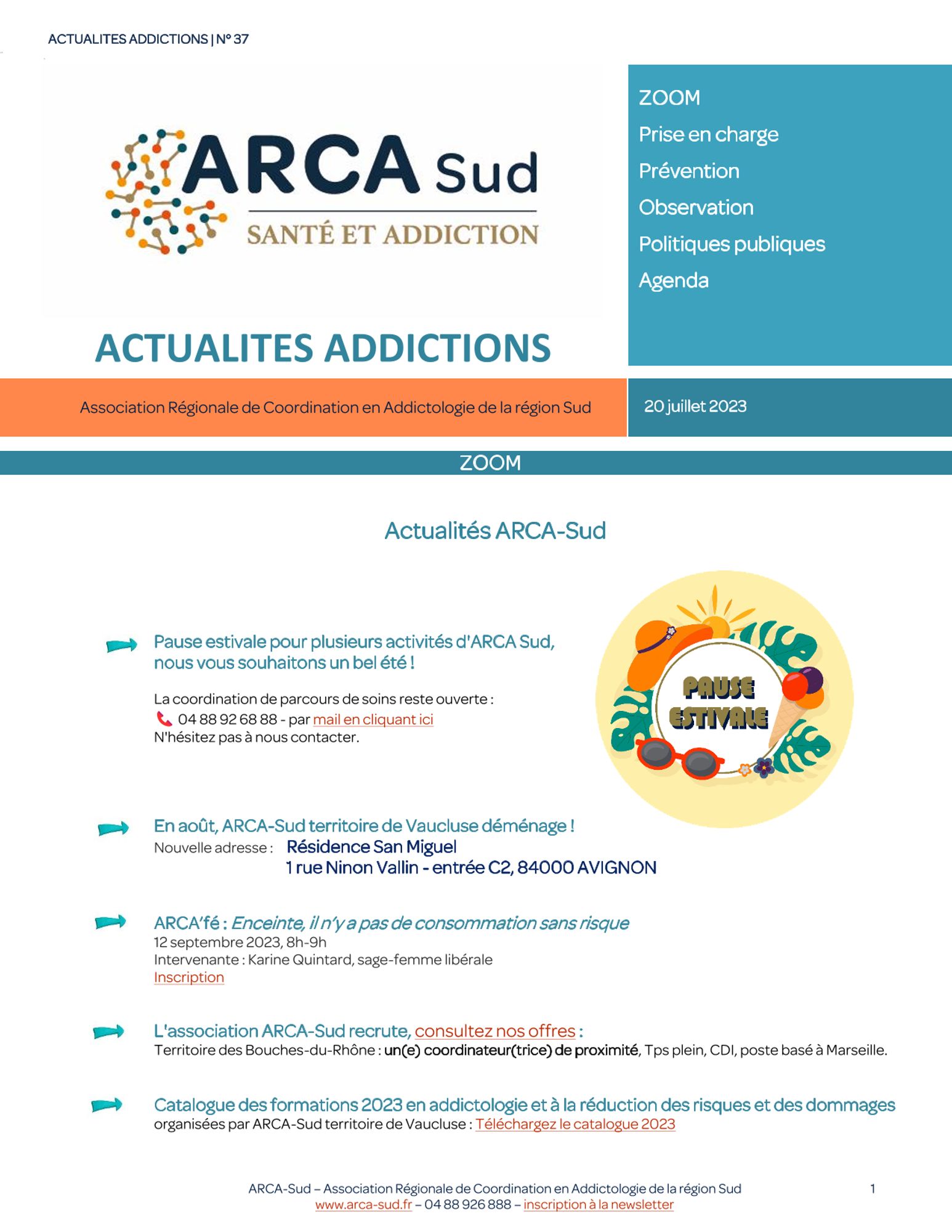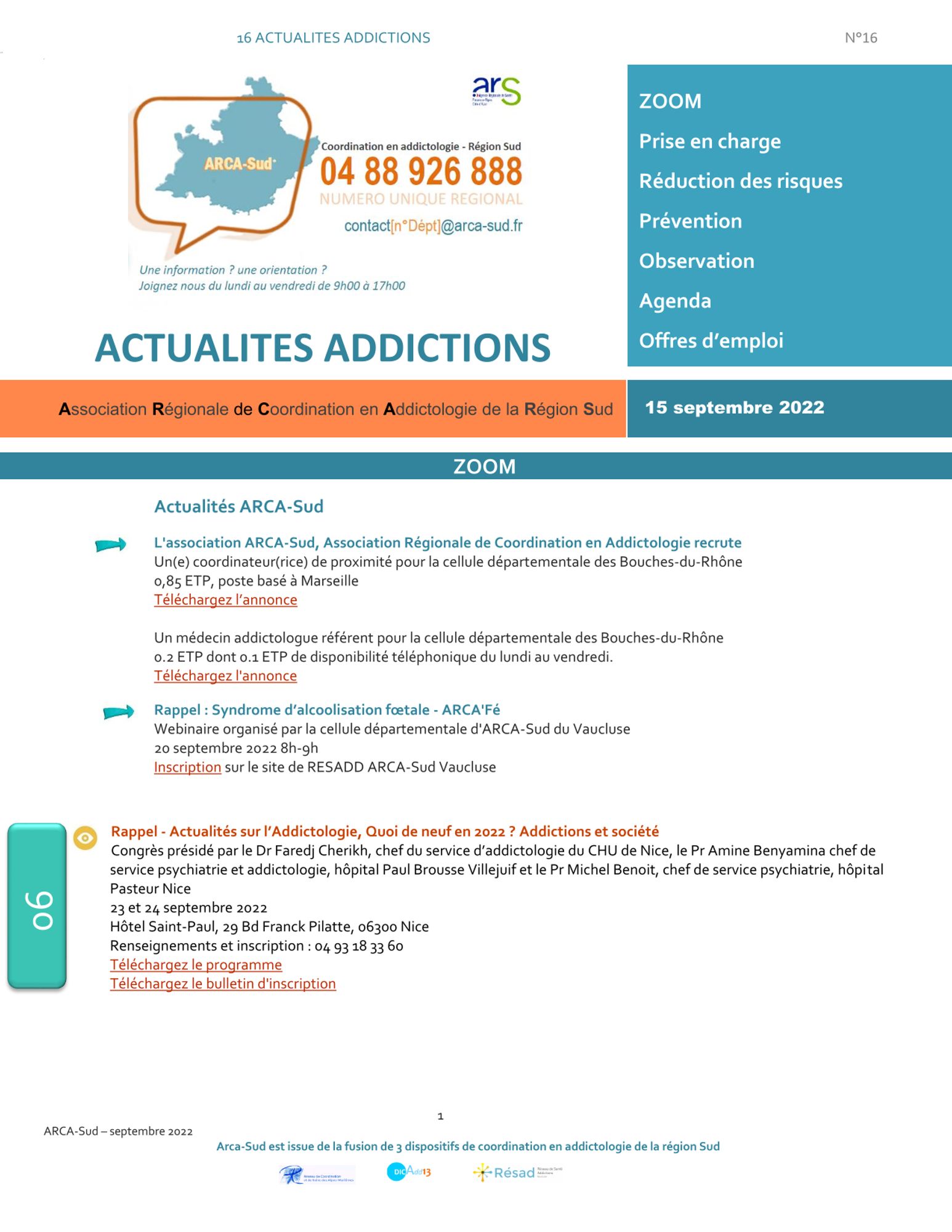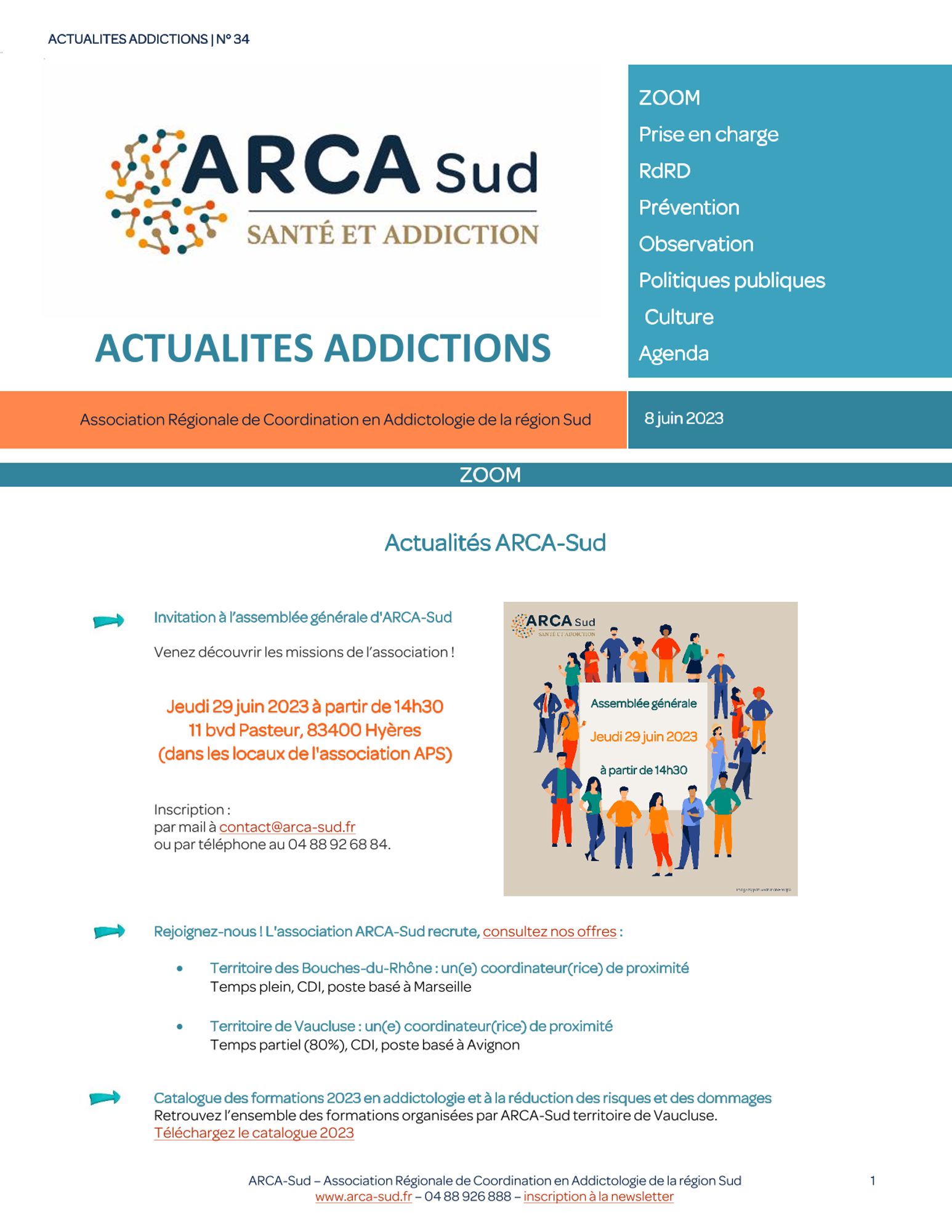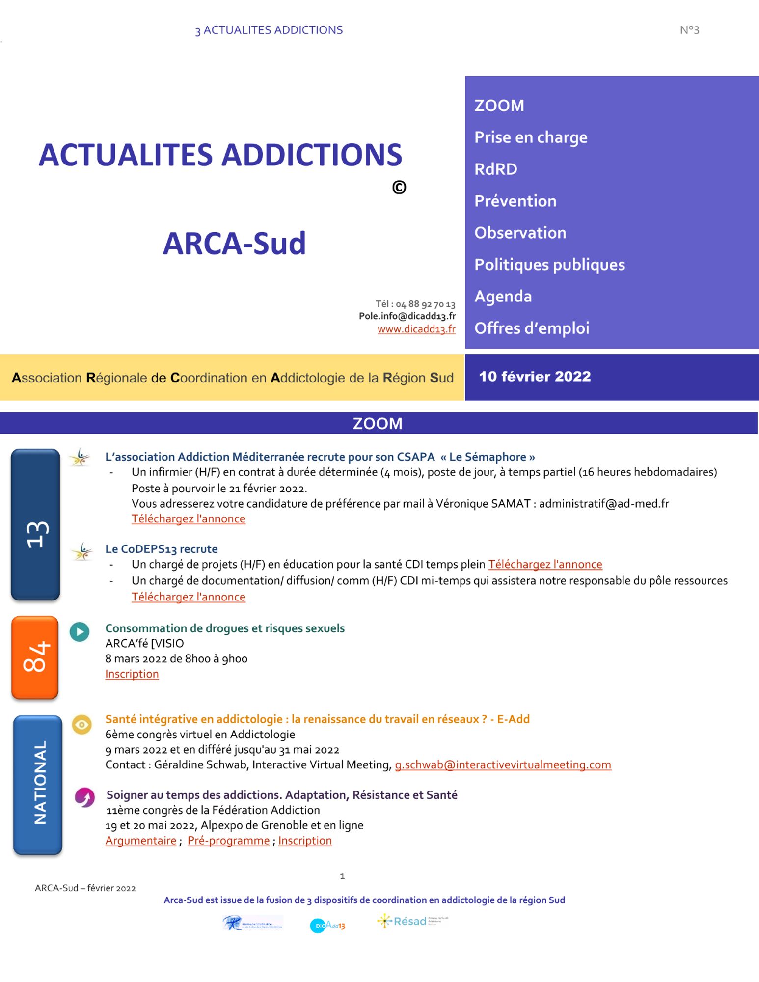 Chaque mois, deux newsletters résument l'actualité : prise en charge, réduction des risques et des dommages, prévention, données d'observation, politiques publiques, l'actualité en région PACA et au national.