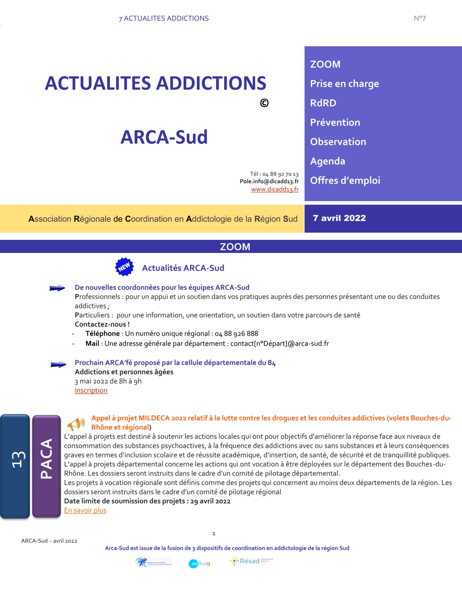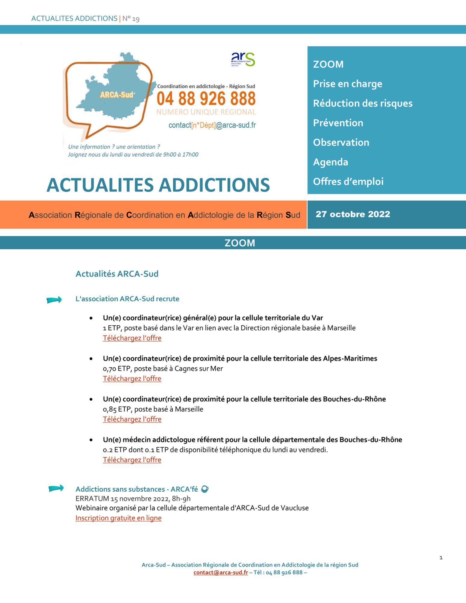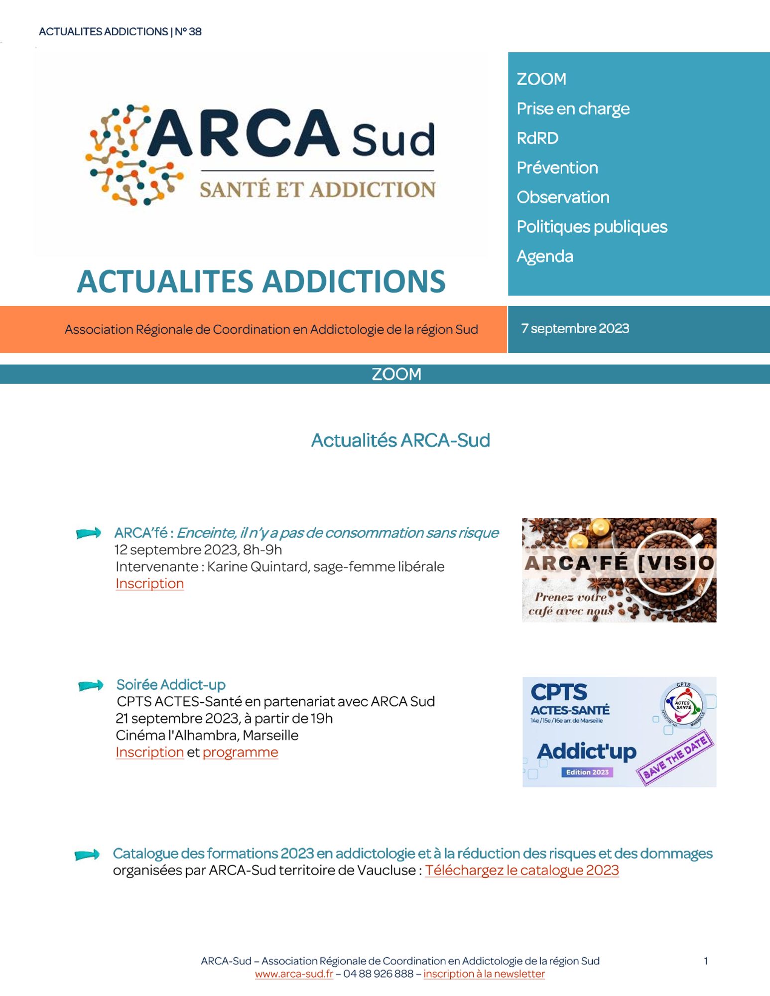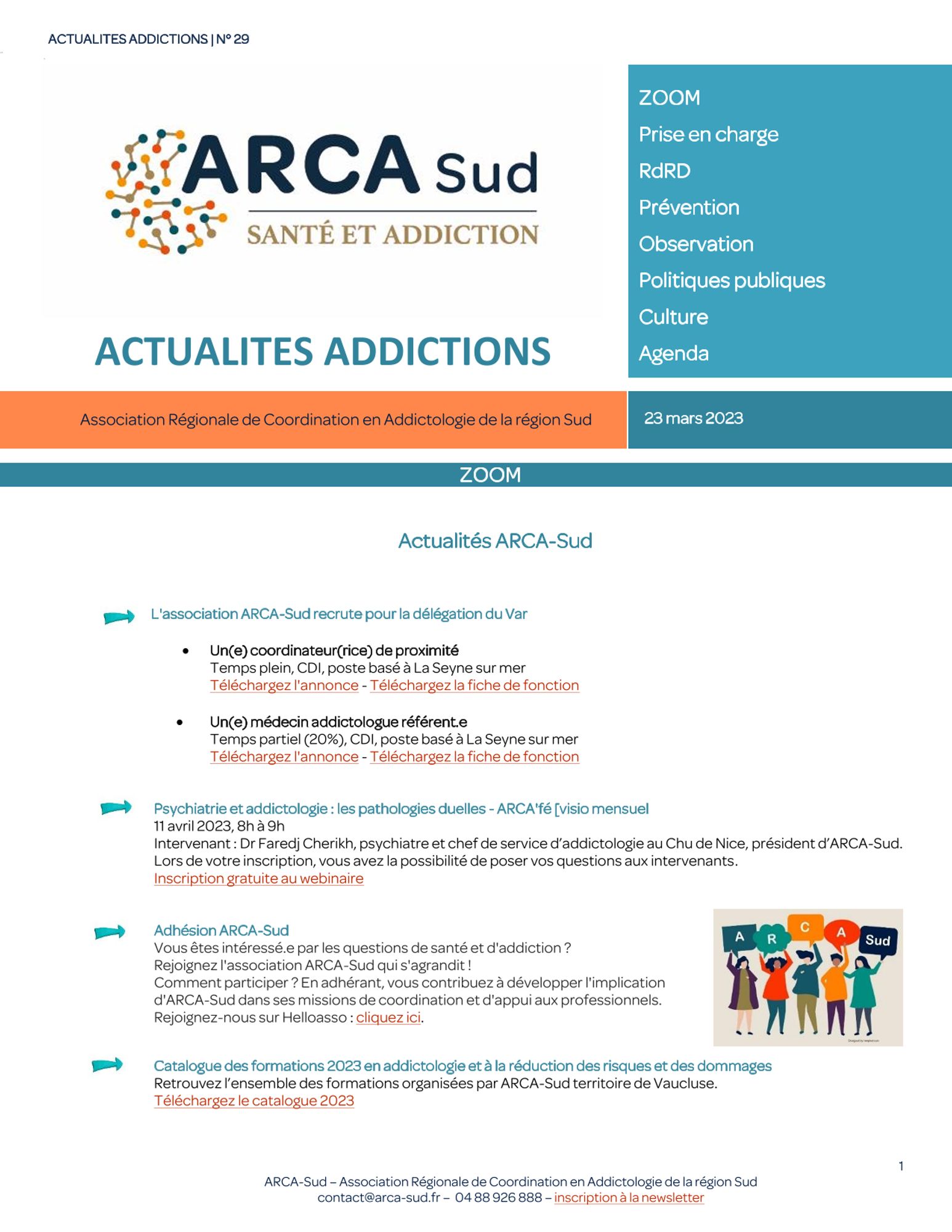 Chaque mois, deux newsletters résument l'actualité : prise en charge, réduction des risques et des dommages, prévention, données d'observation, politiques publiques, l'actualité en région PACA et au national.