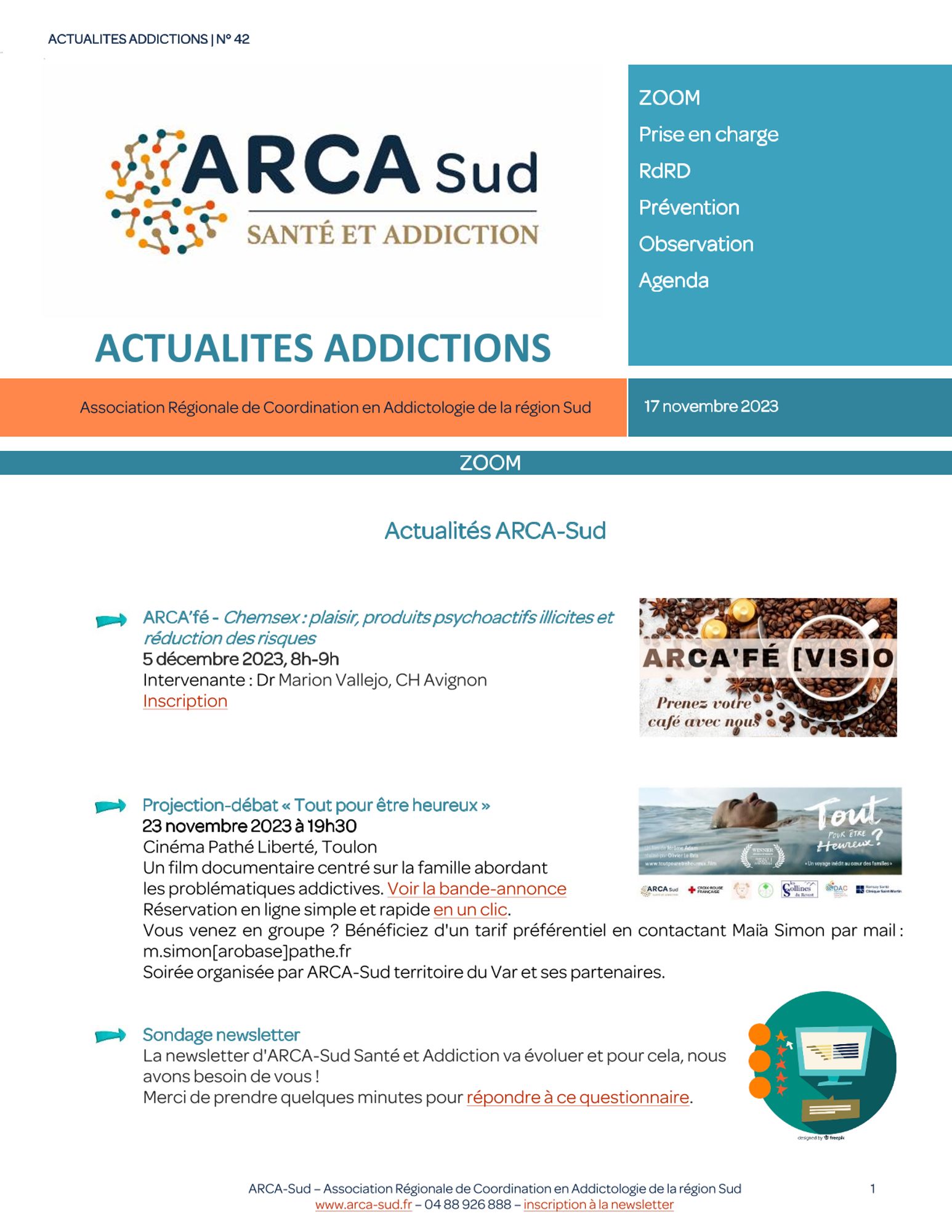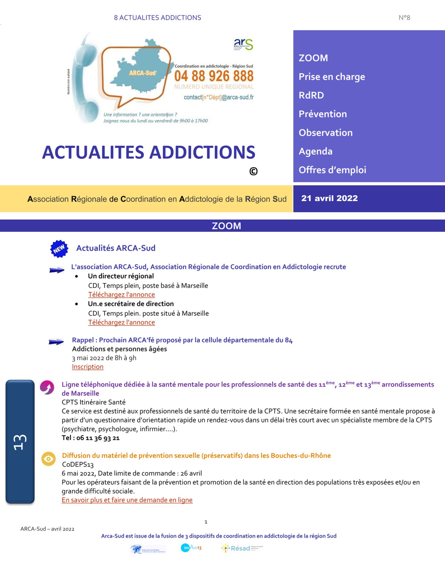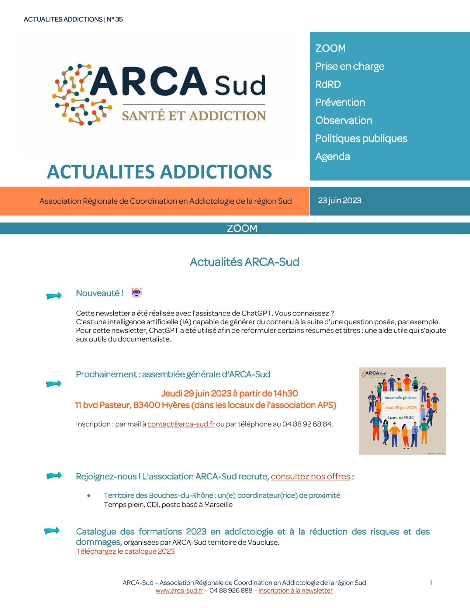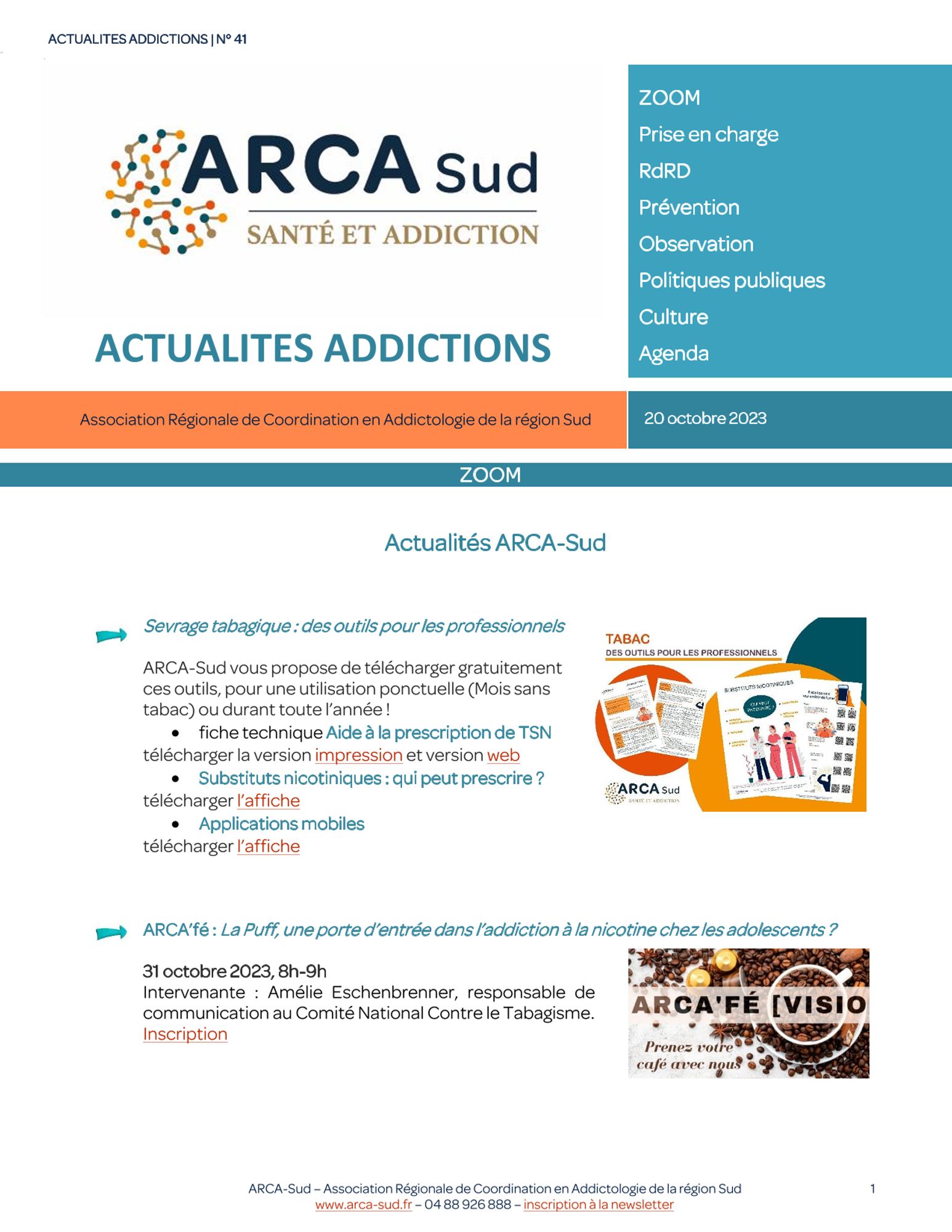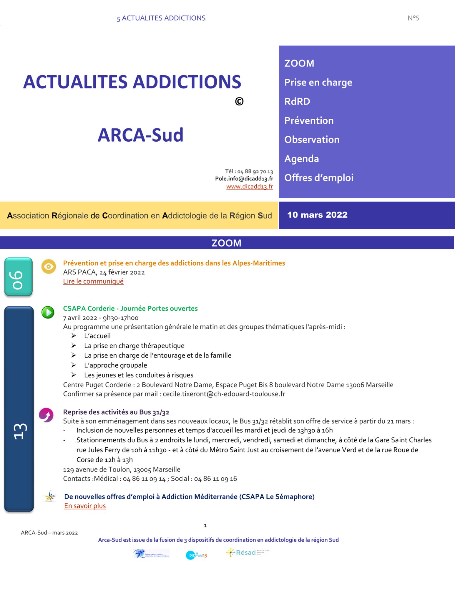 Chaque mois, deux newsletters résument l'actualité : prise en charge, réduction des risques et des dommages, prévention, données d'observation, politiques publiques, l'actualité en région PACA et au national.